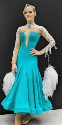 SK-LBE14 「EMクチュール」がドイツのシニアチャンピオンのために制作した、ネックラインから袖にかけての白いレース、フロートのオーストリッチが超美しいピーコックブルーの長袖のスタンダードドレス(9号)
