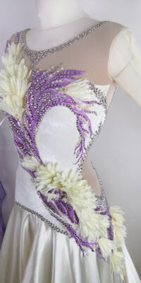 SK-LBE15 リトアニア製のアイボリーのベルベット&サテンにライラック色のレースモチーフを組み合わせた、超スタイルよく見える長袖のスタンダードドレス(9号)