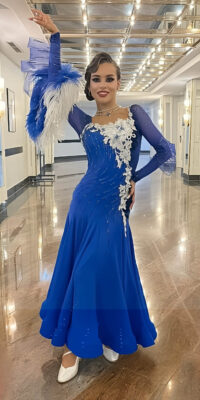 SK-LBE13 EMクチュールがドイツのトップ選手のために制作したロイヤルブルーに白のレースを組み合わせた長袖のスタンダードドレス(9号)
