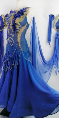 SK-LBE13 EMクチュールがドイツのトップ選手のために制作したロイヤルブルーに白のレースを組み合わせた長袖のスタンダードドレス(9号)