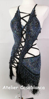 LK-LBC3 ウクライナのチャンピオン、ヴィクトリア・マイスター選手着用の全身に石びっしりの超かっこいい黒&ブルーのフリンジのラテンドレス(7-9号)