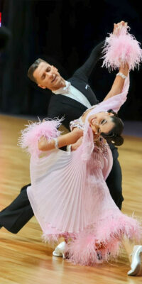 SK-LBE9欧州選手権ブロンズメダリスト着用の、スタイリッシュで超かっこいいレースとオーストリッチづかいが美しいパンツスタイルのピンクのスタンダードドレス(7ー小さ目9号)