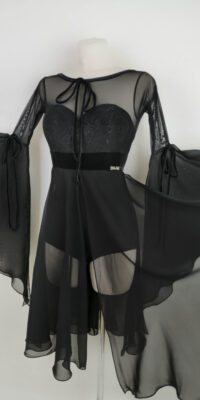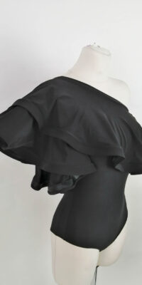 TK-LBE13TK-LBE13「Evoly Design」制作のスタイリッシュでフリルが超美しいアシンメトリーな黒のレオタード(9号、受注生産で別のサイズ&各色制作可能)