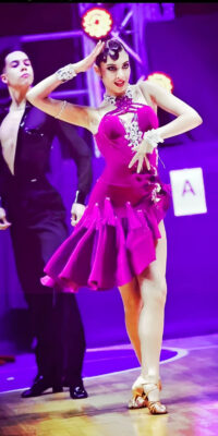 LK-JBE3 「ガリーナ・ペトルナ」制作のアシンメトリーなフレアのスカートが大変よく踊るフューシャピンクのベルベット素材のラテンドレス(9号)