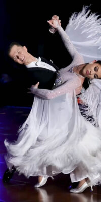 SK-JBE10 世界チャンピオン、ブラックプールチャンピオンのために「カタリーナ」が制作した、オーストリッチの羽びっしりの超豪華な長袖の白のスタンダードドレス(9号)