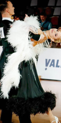 SK-JBE6 ロシアの「Savich」制作!オーストリッチの羽と石が超豪華な長袖のブラック&ホワイトのスタンダードドレス(9号)