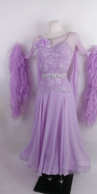 SK-BBF1オーストリッチの羽とスワロフスキが美しい小柄な方向けのライラック色のスタンダードドレス(7-9号、身長155まで)