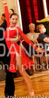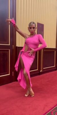 LK-DBD2ウクライナのチャンピオンのために「イバン・サルガド」が制作した、スタイリッシュで超かっこいいピンクのアシンメトリーなルンバスタイルのラテンドレス(7-9号、小柄な方向け)