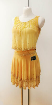 LK-HBE2 全身のフリンジが大変良く踊るイエロー、ピンク、紫を組み合わせた石なしのラテンドレス(7-9号、小柄な方向け)