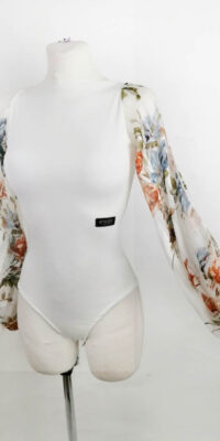 TK-KBE6 ルーマニアの「Evoly Design」制作!世界チャンピオンと色違いの花柄のジョーゼットの袖が大変美しい白のレオタード(7号、9号、11号制作OK)