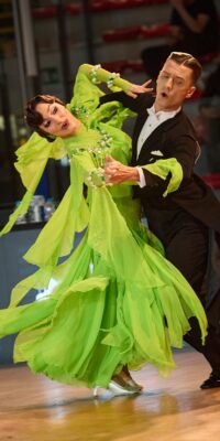 SK-CBF10ブラックプールセミファイナリストのためにエディタ・ダニウテがデザインしてリトアニアのDLKが制作した、黒&ベージュのスタンダードドレス(9号)