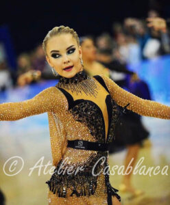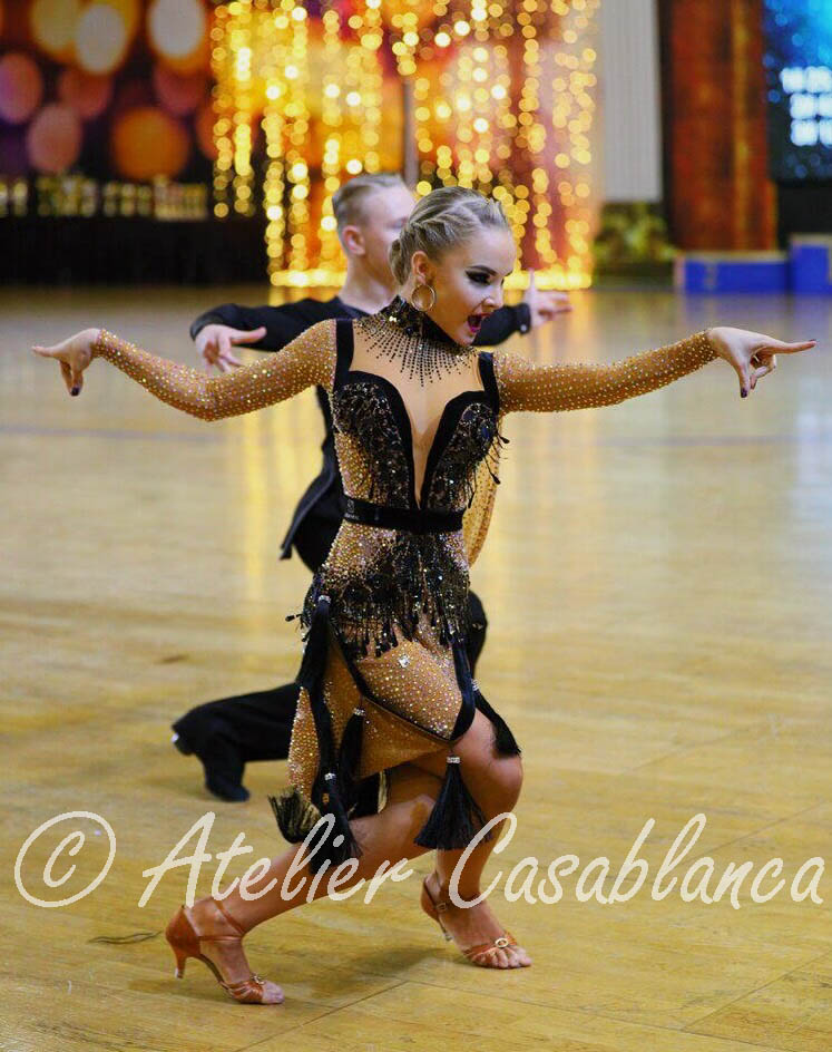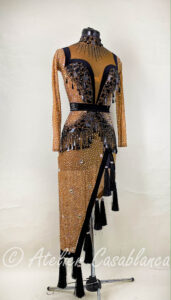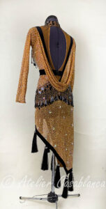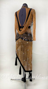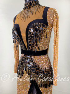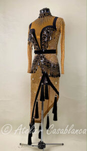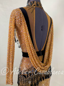 ベージュのメッシュ素材で制作されており、ボディにはベルベットの美しいラインが入っていてロングのスカートも黒のベルベットのラインで縁取りされています。ロングのルンバスタイルですが、黒のタフトフリンジも一緒によく踊るので、全種目向きの大変ゴージャスなドレス。