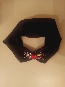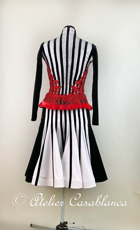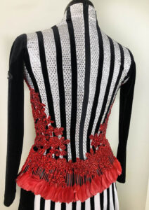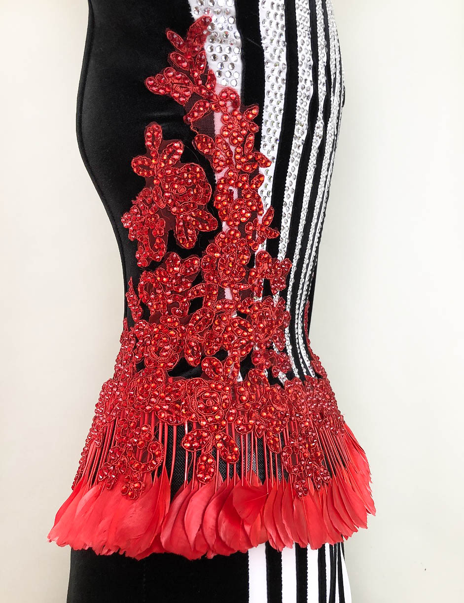 ラグジュアリーな質感が美しい黒のストレッチベルベット素材と白のストレッチライクラを組み合わせて作っていて、ウエストのラインを細く見せるようにベージュに切り替えがあり、赤のレースモチーフの装飾があります。モチーフ上には赤のスワロフスキの石がびっしりと貼られいて、整然と敷きつけられた赤の羽の装飾が非常に印象的です。