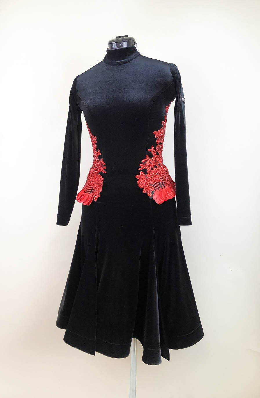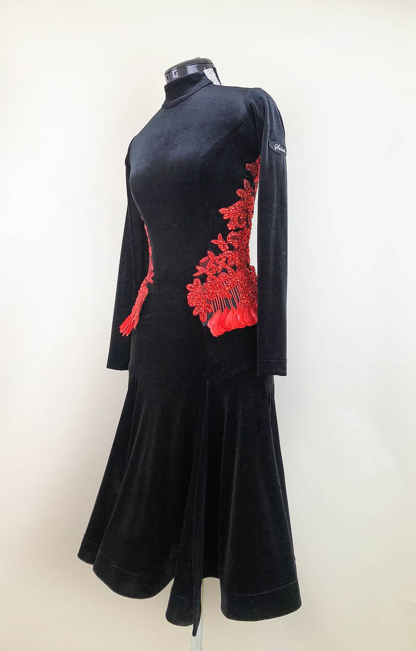 LK-CAH10 超スタイルよく見えるスタイリッシュなハイネック長袖の黒ベルベット&赤白のラテンドレス(9号)