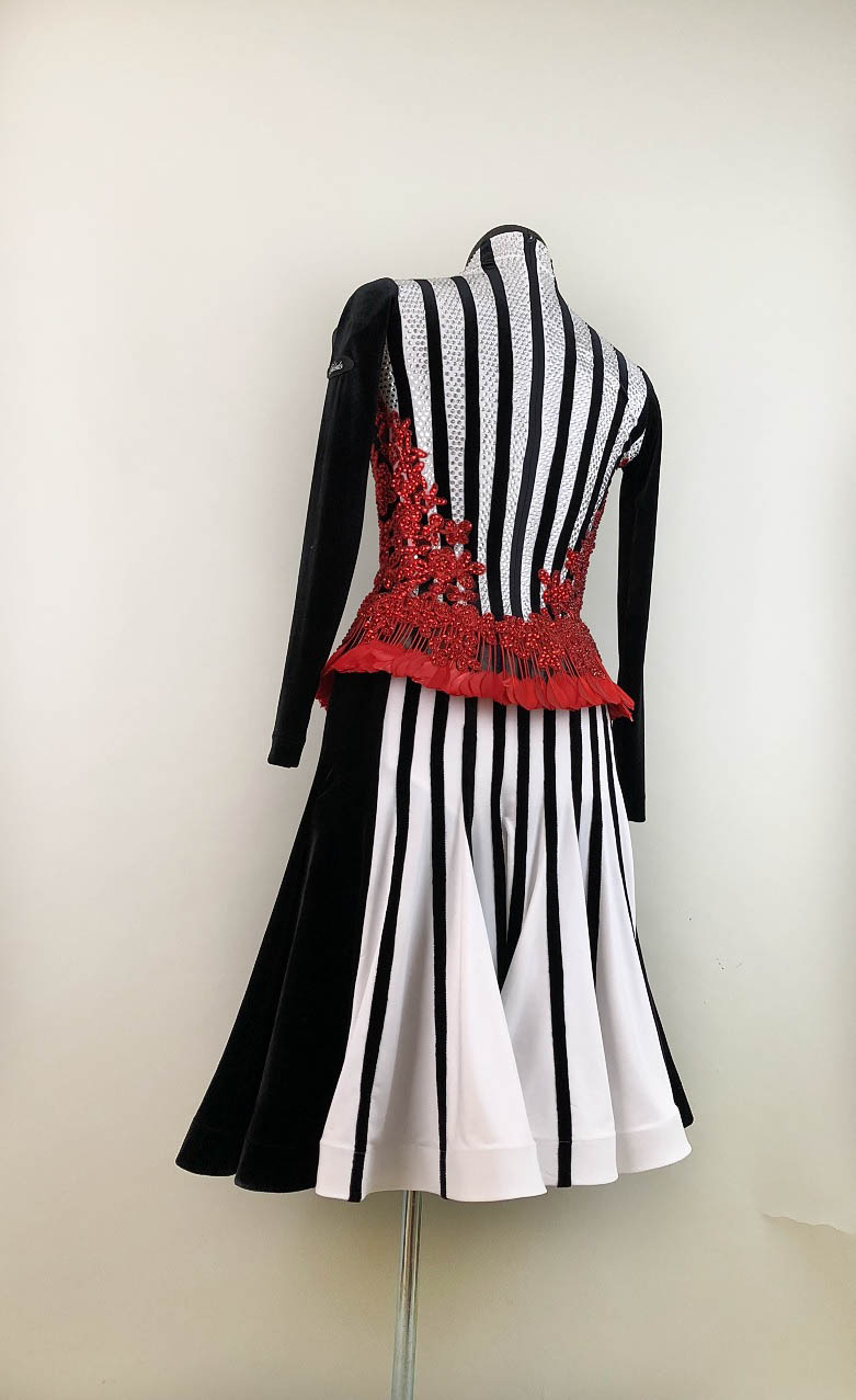 バックスタイルのストライプのデザインとウエストの赤のモチーフ、羽のモチーフが大変美しく個性的で豪華なハイネック長袖の黒のラテンドレスです。未使用の新品で、ラトビアの超素晴らしいスタイリッシュなダンスドレスブランド、Saledoの制作。