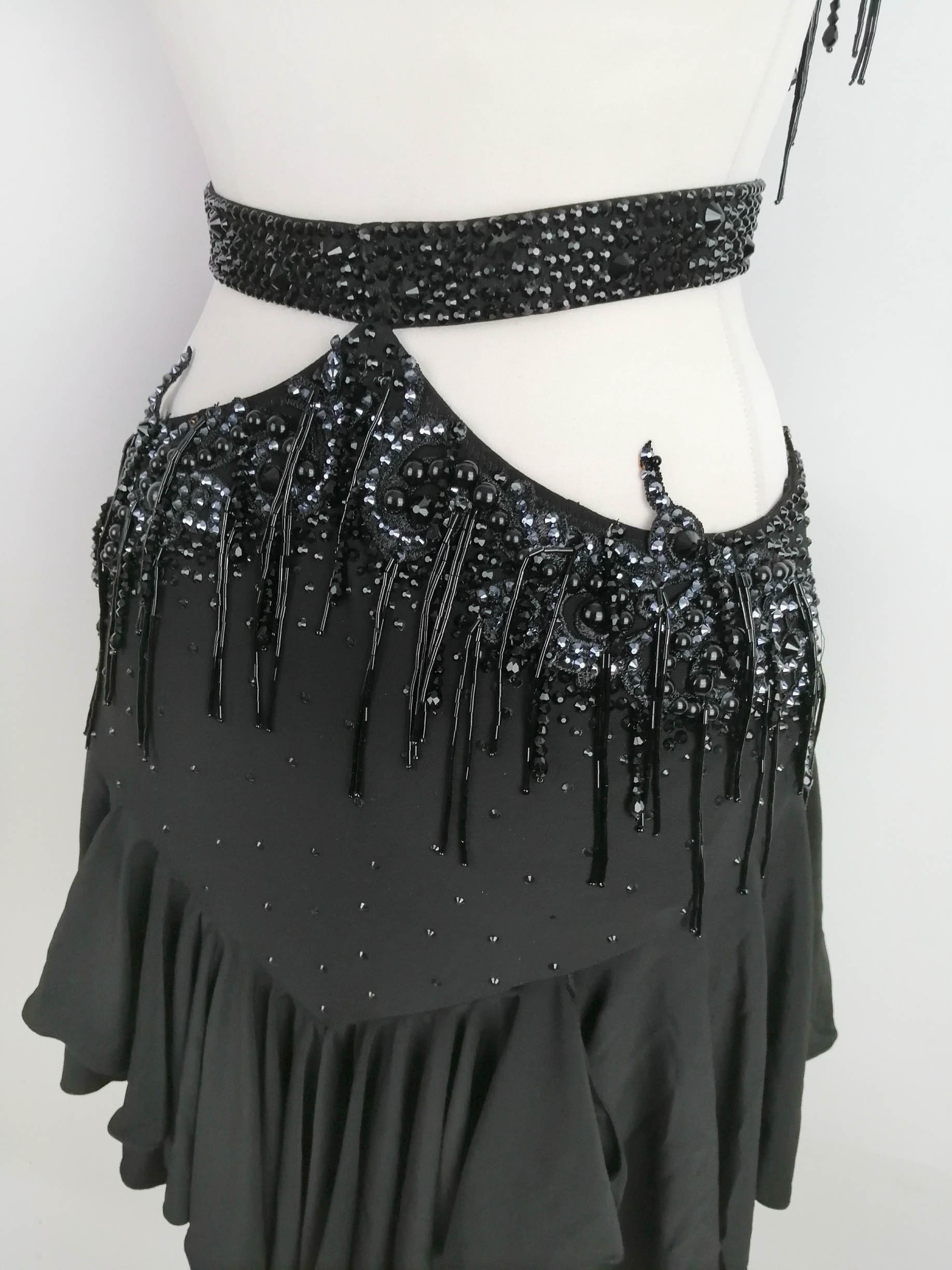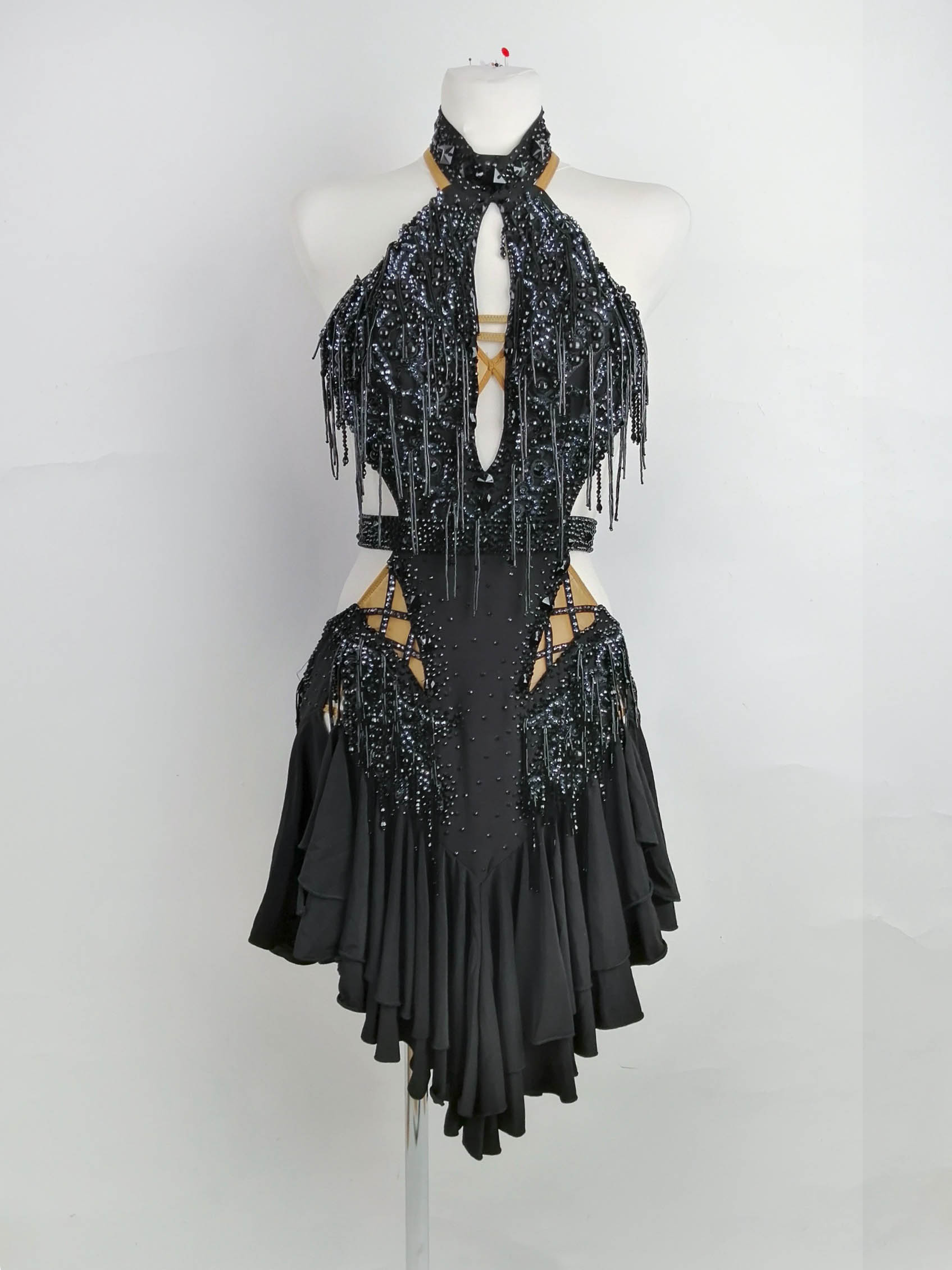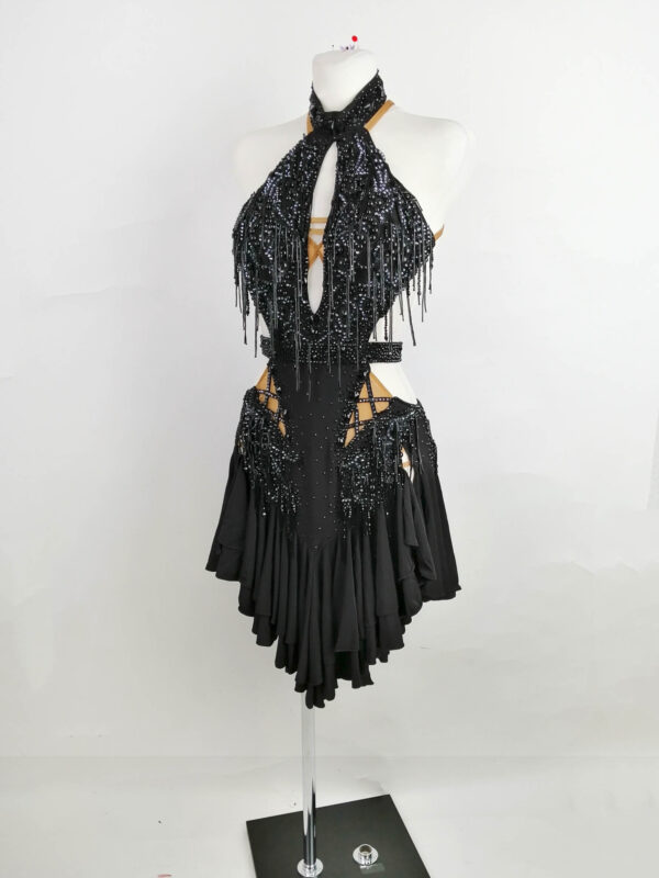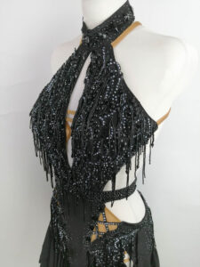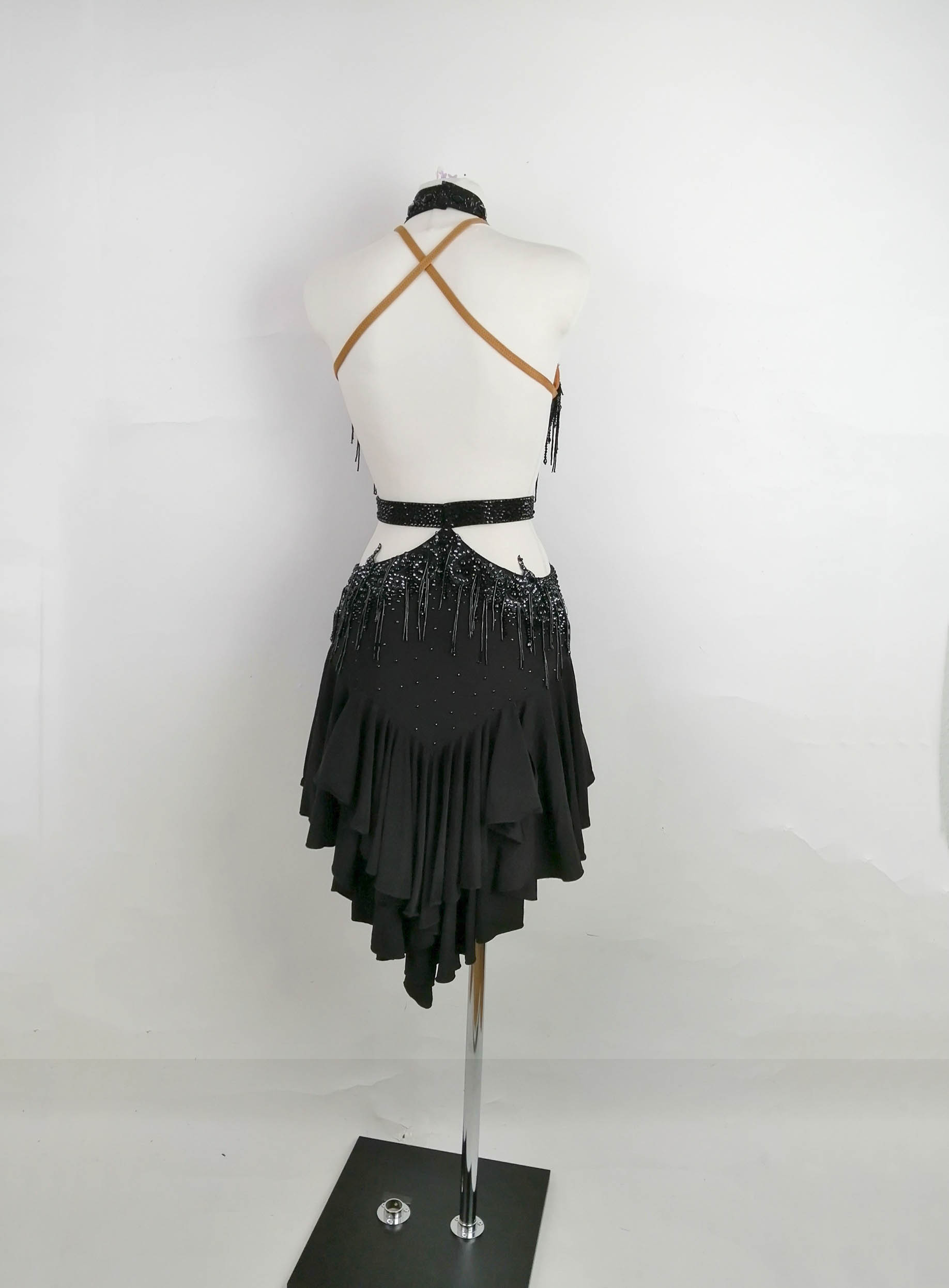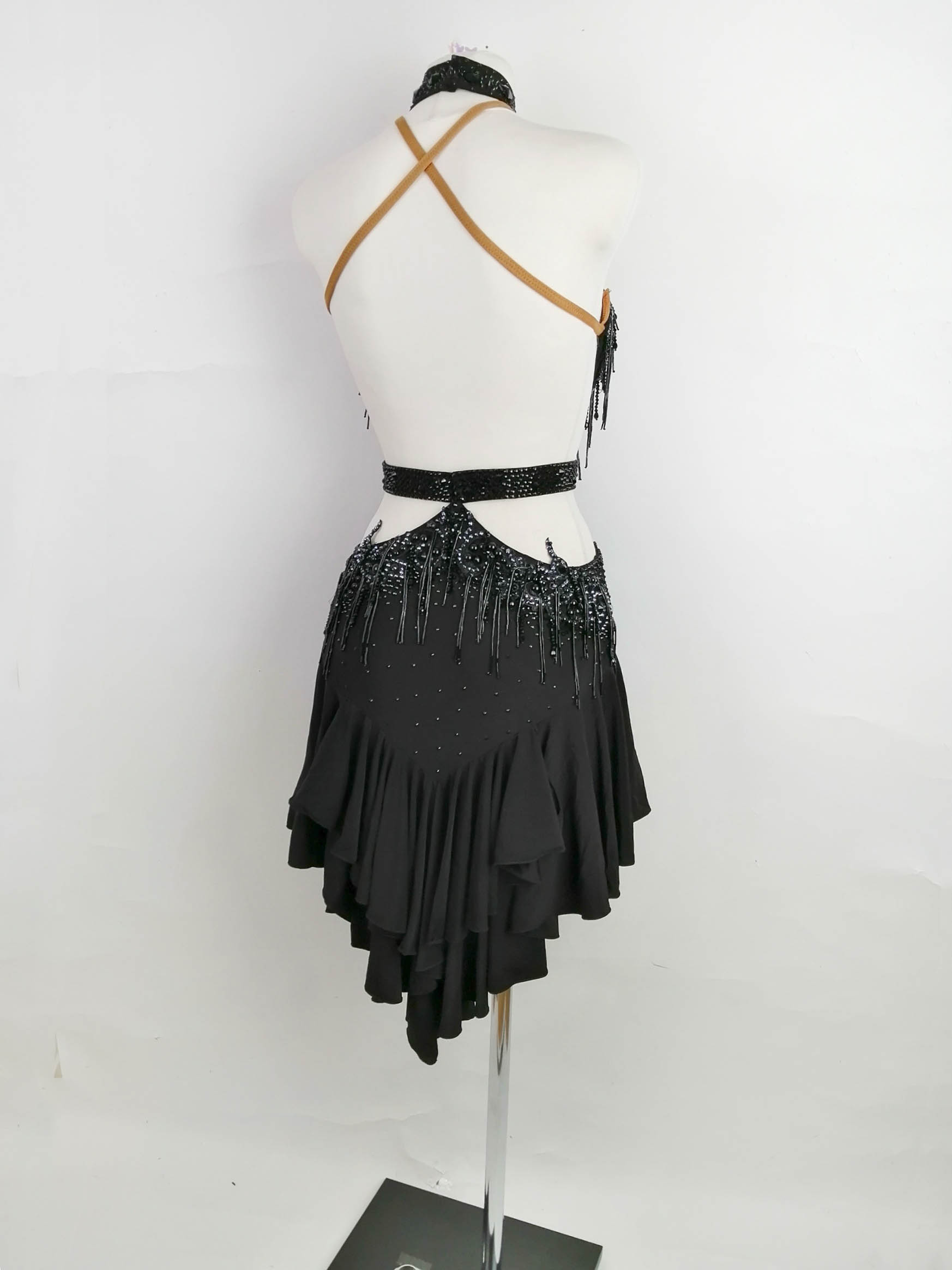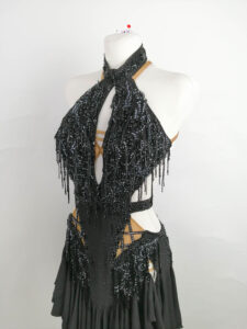 ホルターネックで竹ビーズフリンジとスカートのフリルが大変よく踊る黒のラテンドレスです。