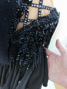 “LK-IBE2 竹ビーズフリンジとレースモチーフの装飾が大変美しいホルターネックの黒のラテンドレス(9号)” の口コミを投稿します
