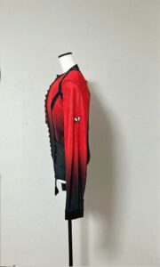 男性のウェアも赤から黒のグラデーションが大変美しく、足長で逆三に見えるデザイン。黒のラインが大変スタイリッシュでドレスとマッチしている美しいペアドレスです。