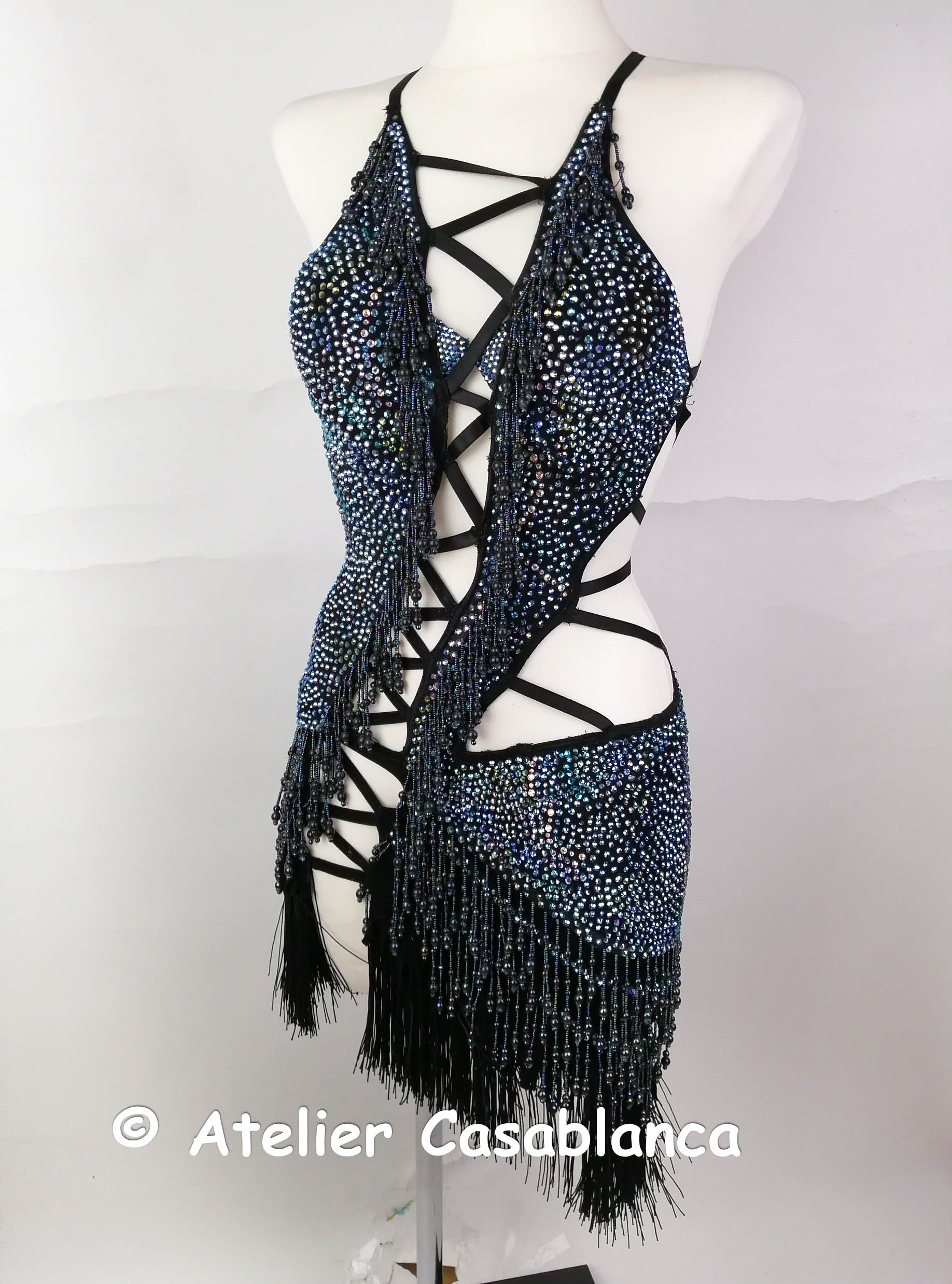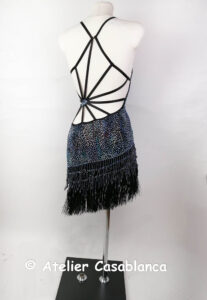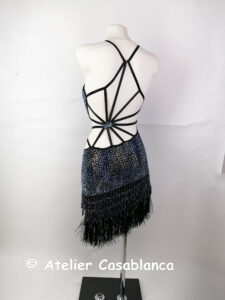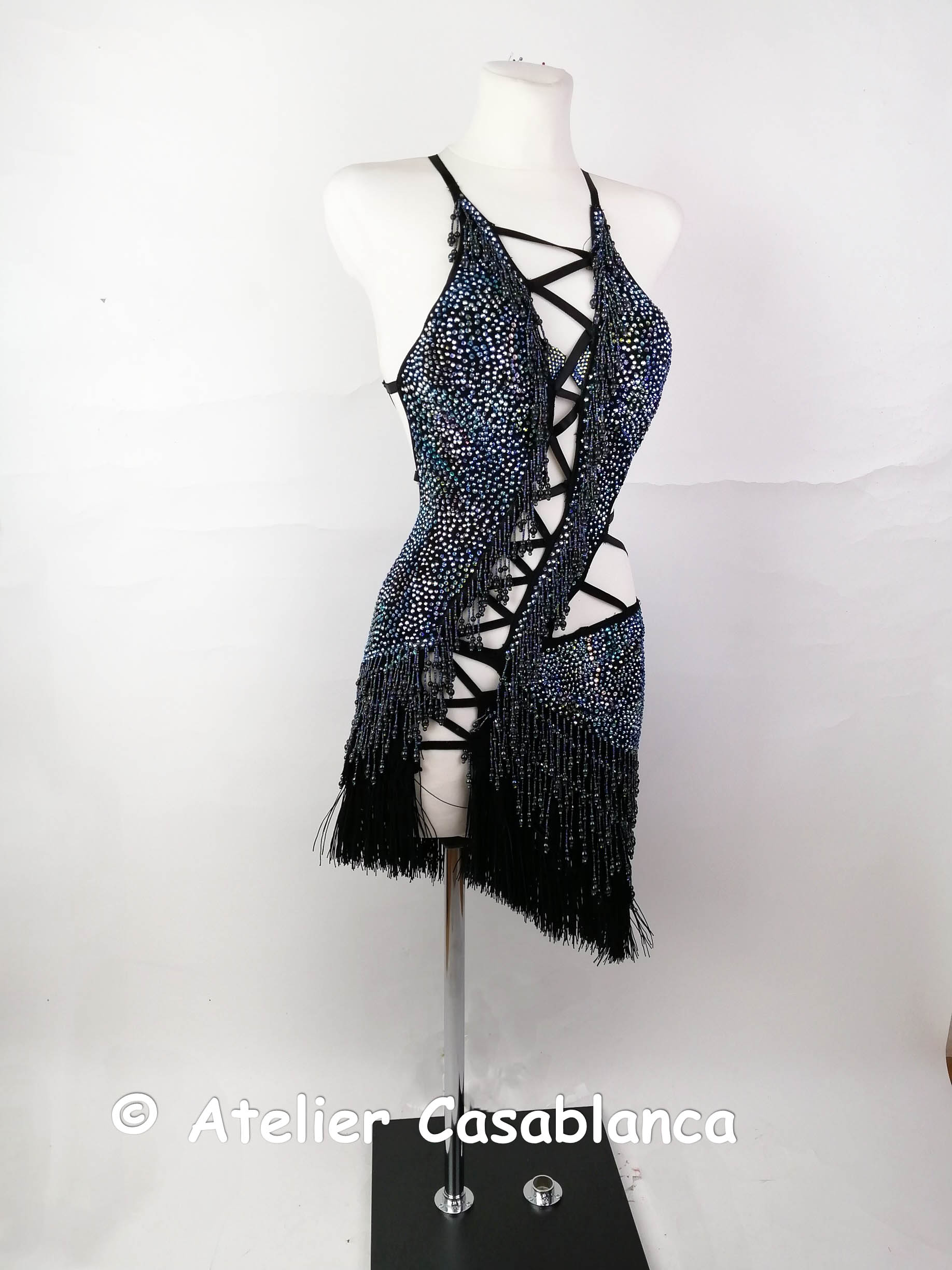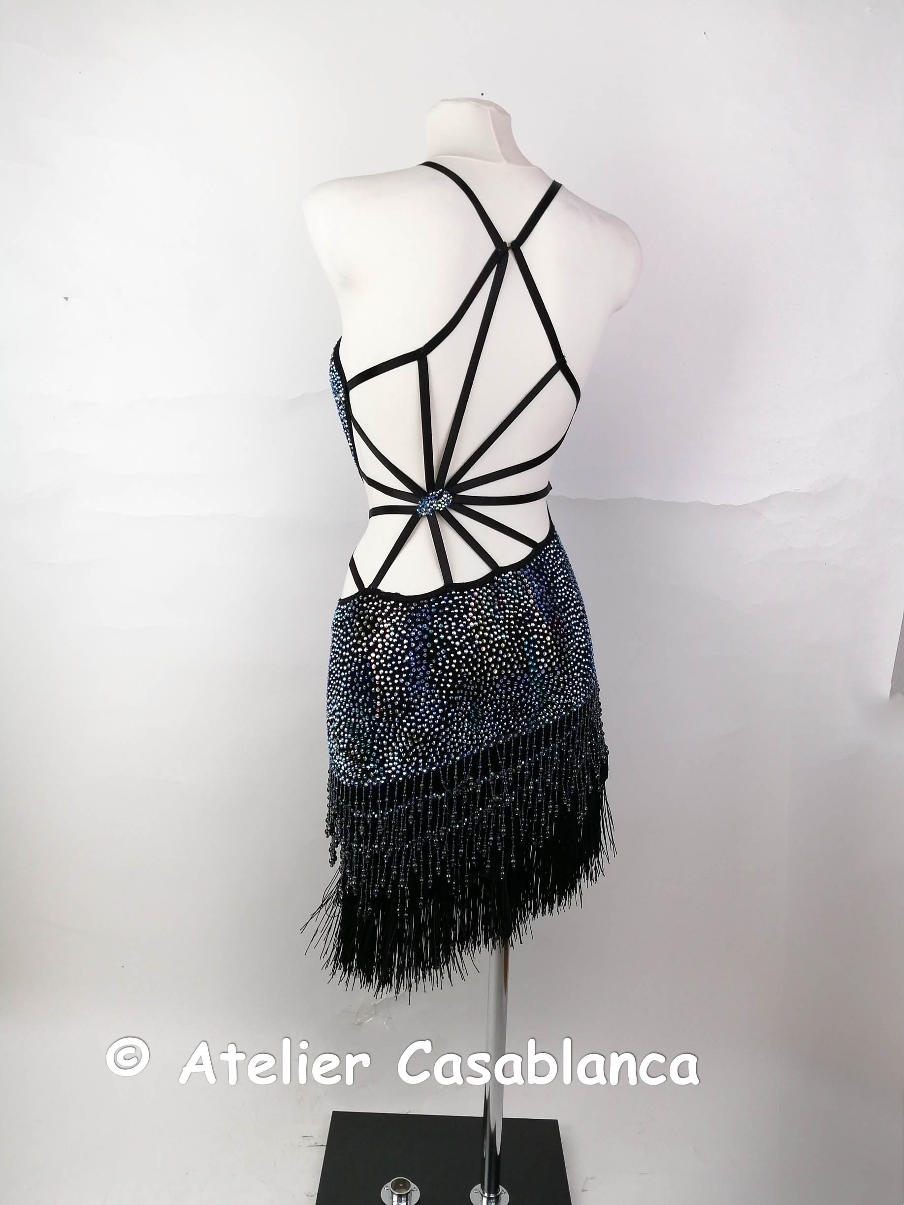 LK-LBC3 ウクライナのチャンピオン、ヴィクトリア・マイスター選手着用の全身に石びっしりの超かっこいい黒&ブルーのフリンジのラテンドレス(7-9号)