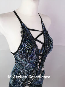 ウクライナのチャンピオンのタイトルを持ち、2025年10月のロンドンインターではセミファイナルに入賞した大変すばらしい世界トップクラスのラテンダンサー、ヴィクトリア・マイスター選手着用の全身石ぎっしりの超スタイリッシュでかっこいいアシンメトリーな黒&ブルーのラテンドレスです。