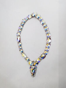 管理人自身がイベントで1回、デモを踊った友人に2回だけ貸し出しし、トータルでも数分しか着用されていないほぼ新品で、完璧な状態の豪華なネックレスです。後ろでスナップボタンで留める構造になっています。どのようなドレスにも合わせやすく、また首が詰まって見えないようにあえてV字のラインにしているので首のラインもとてもきれいに見えます。