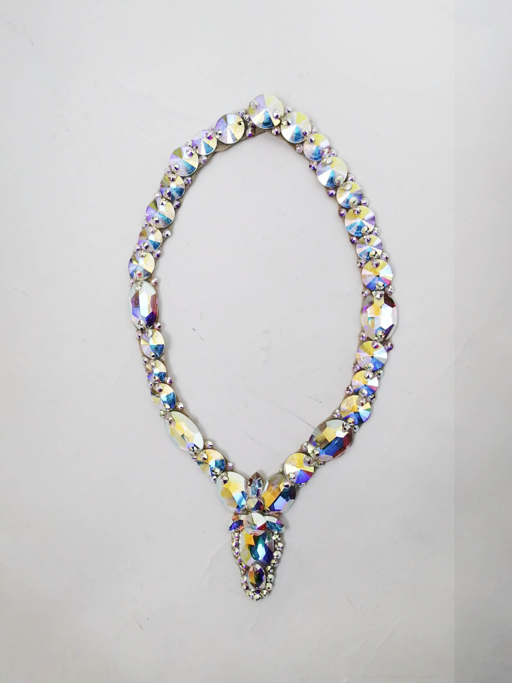 管理人自身がイベントで1回、デモを踊った友人に2回だけ貸し出しし、トータルでも数分しか着用されていないほぼ新品で、完璧な状態の豪華なネックレスです。後ろでスナップボタンで留める構造になっています。どのようなドレスにも合わせやすく、また首が詰まって見えないようにあえてV字のラインにしているので首のラインもとてもきれいに見えます。
