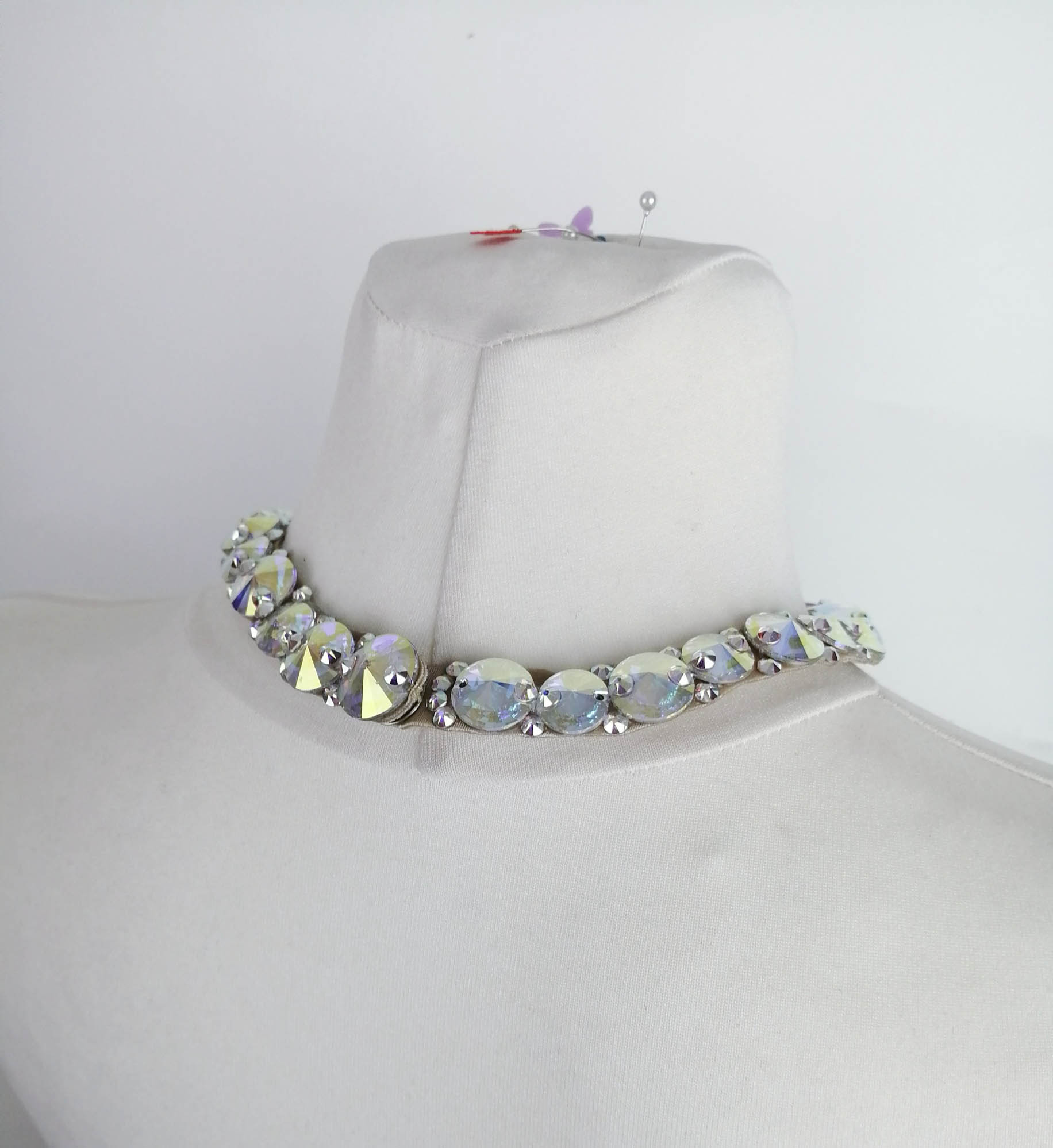 管理人自身所有の、ポーランドでフルオーダーで制作していただいた大きなオーロラのスワロフスキの石を贅沢に使った大変強く豪華に輝くオーロラのネックレスです。ベージュのストレッチライクラを重ねたしっかりとした台の上に強く輝くオーロラのスワロフスキの石が載っていて、立体的で強い輝きが非常に美しいです。