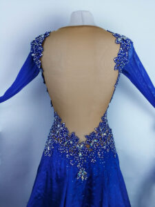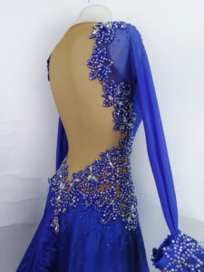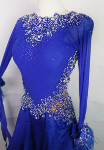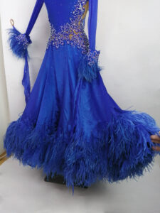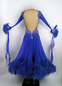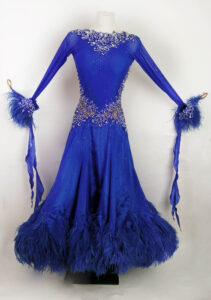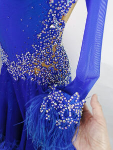 ドイツの超人気ブランドで、アトリエカサブランカでも20年を超えるファンの方がとても多い「ブリッタ・ゲーリッケ」がドイツのシニアS級選手のために制作した、オーストリッチの羽びっしりのスカートが超ゴージャスで美しいオーシャンブルーのスタンダードドレスです。