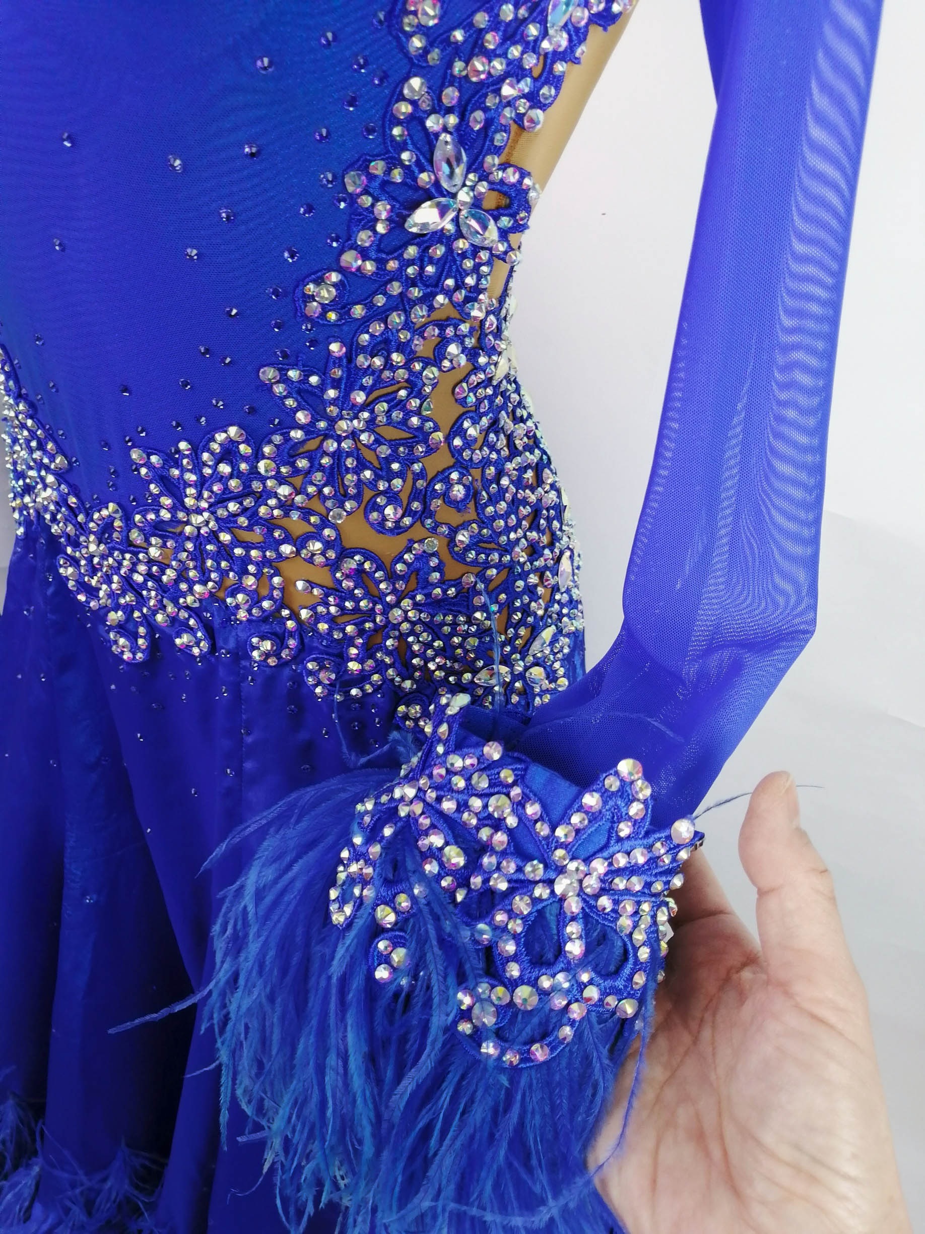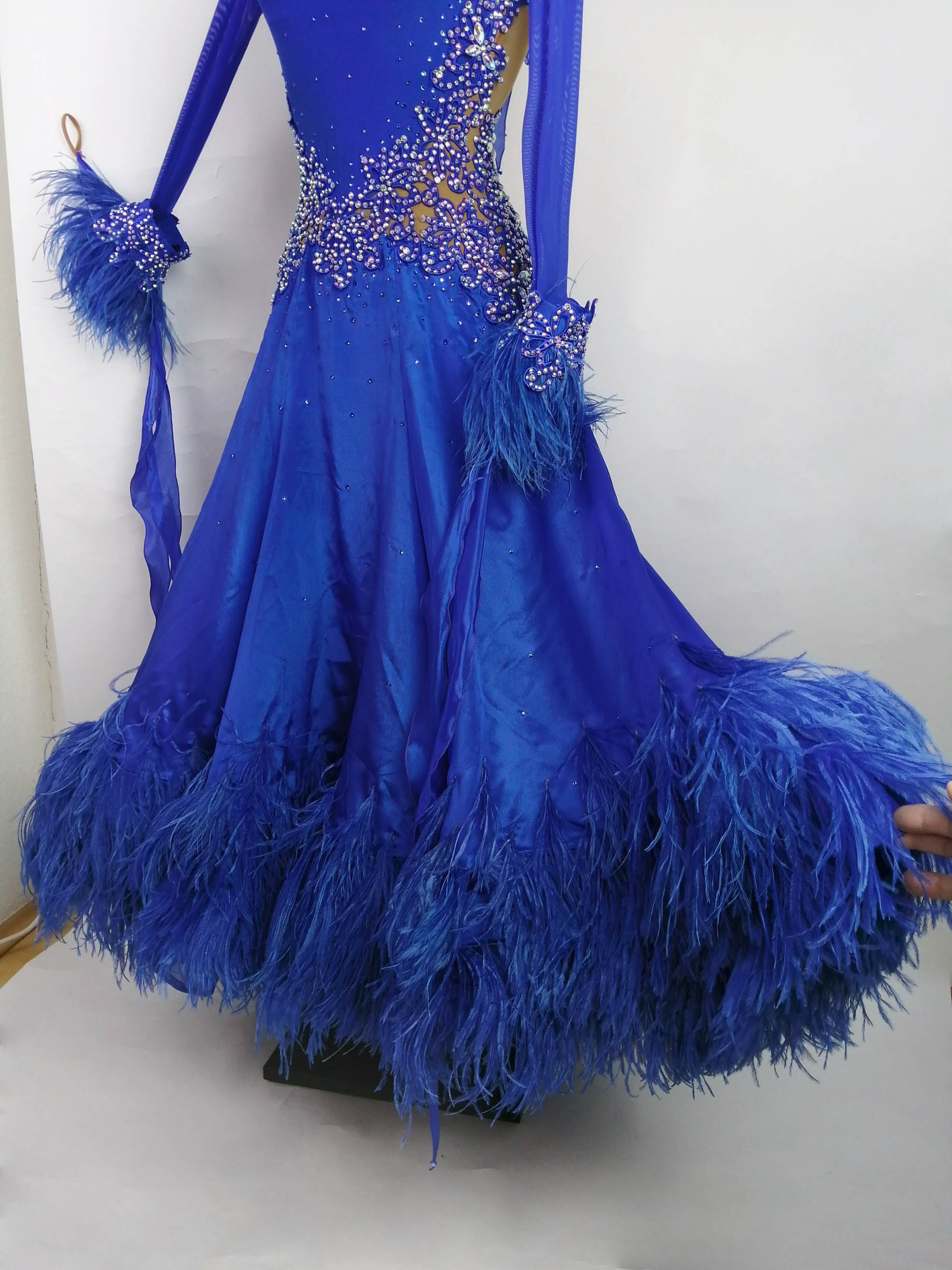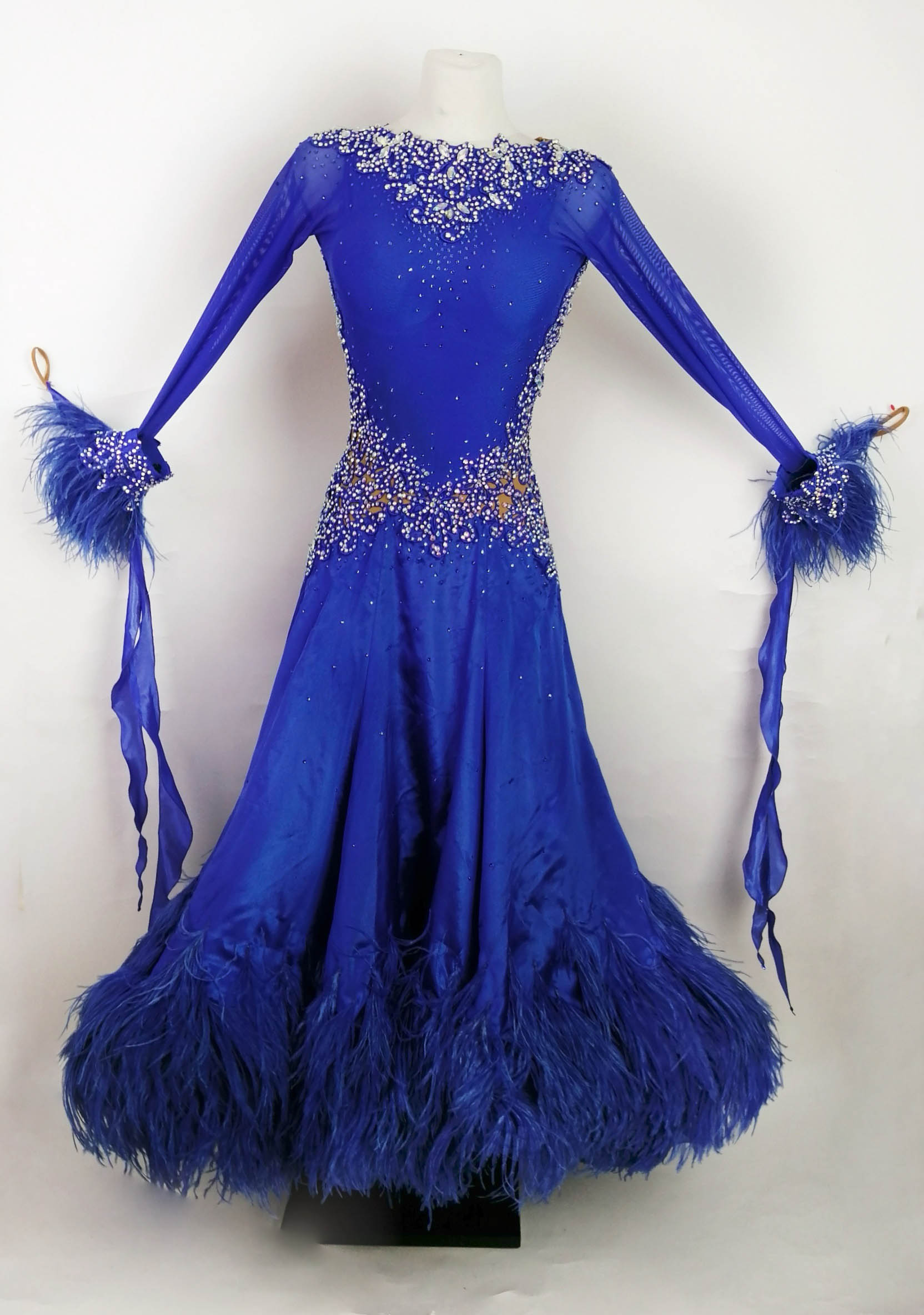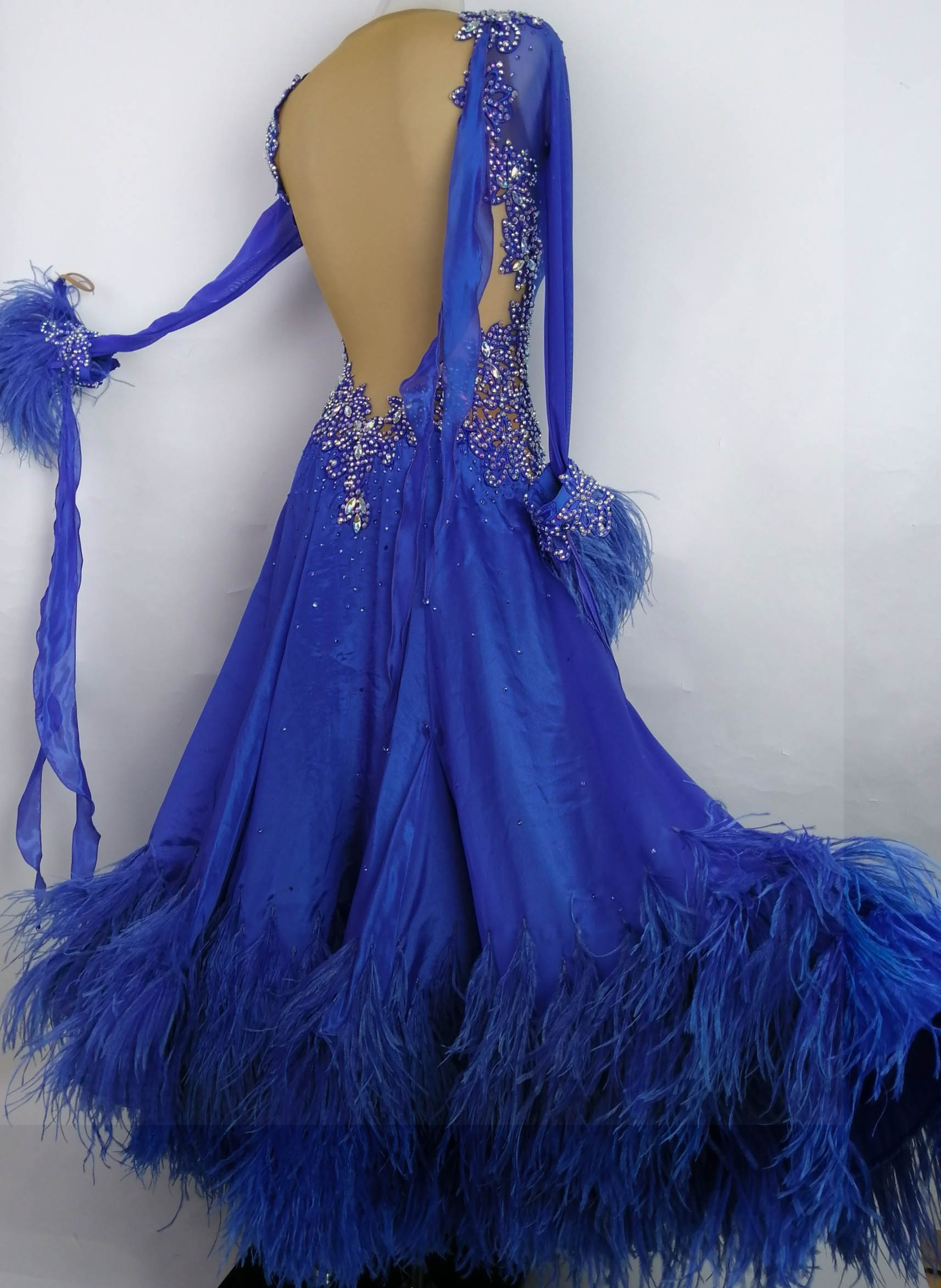 SK-ABF2ブリッタ・ゲーリッケ制作!オーストリッチの羽びっしりのスカートが美しい、超スタイルよく見えるオーシャンブルーの長袖のスタンダードドレス(9号)
