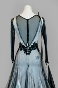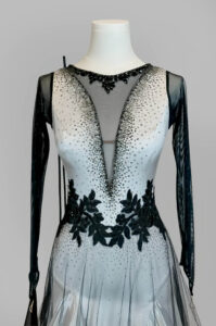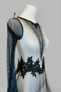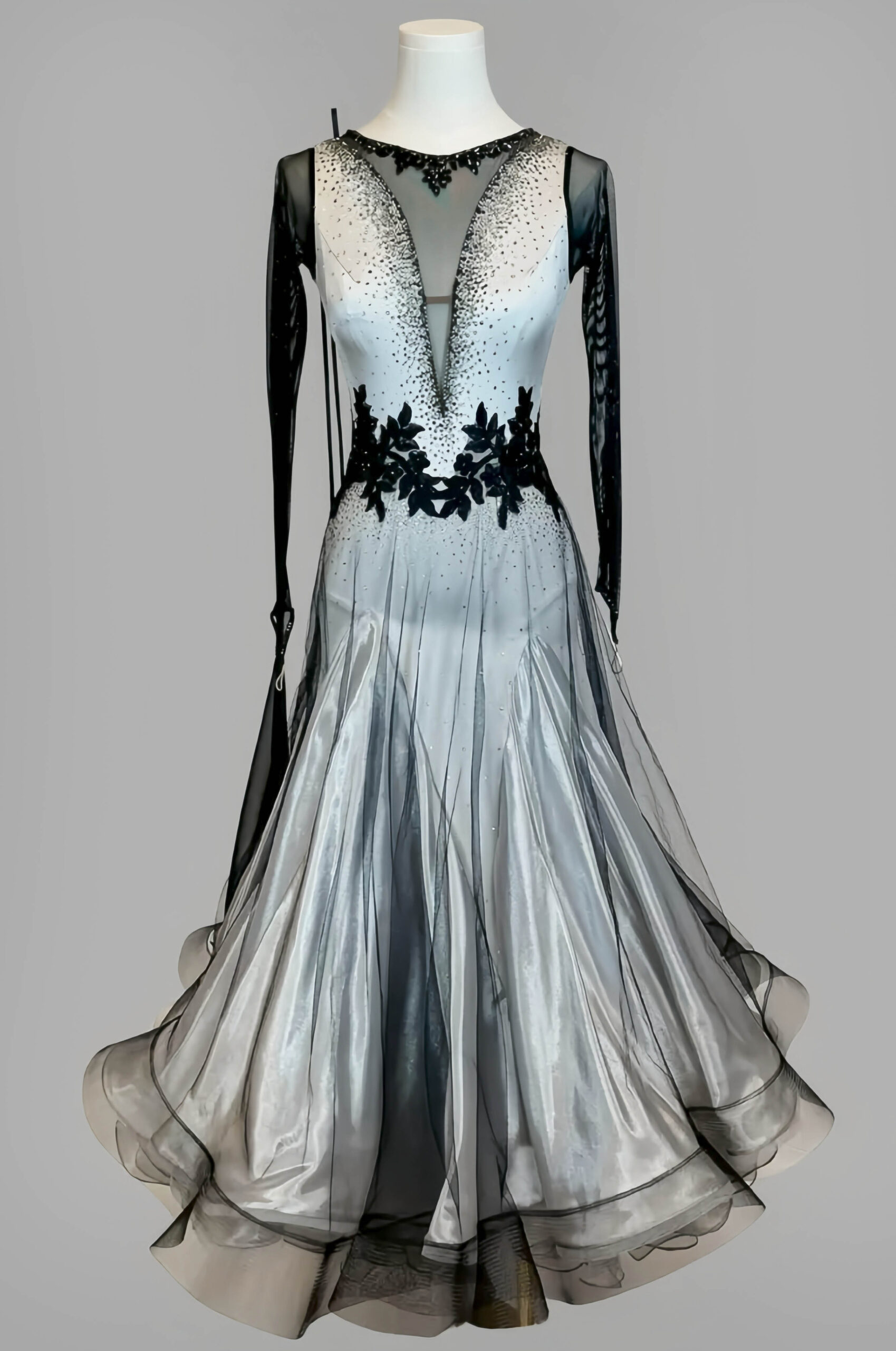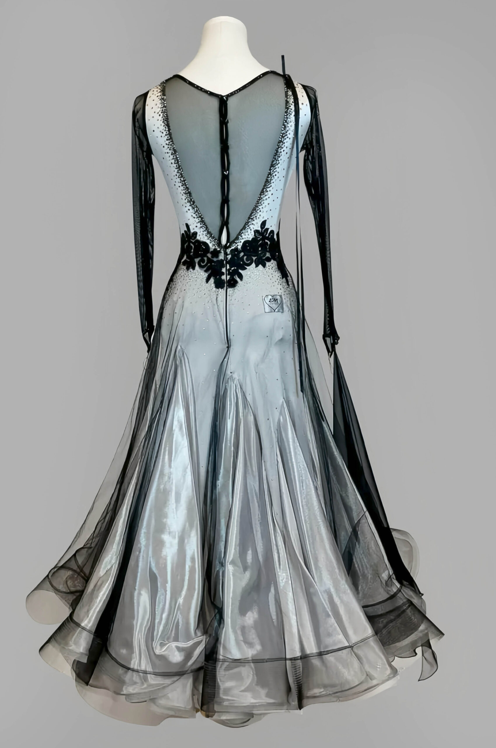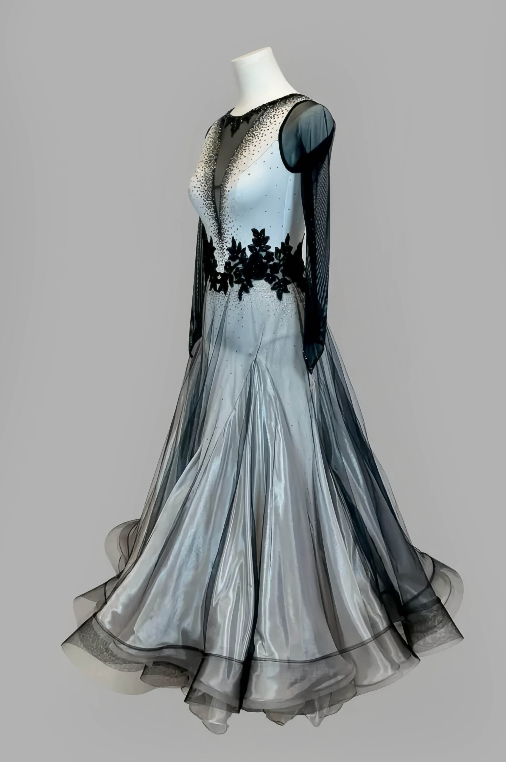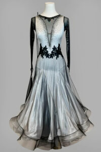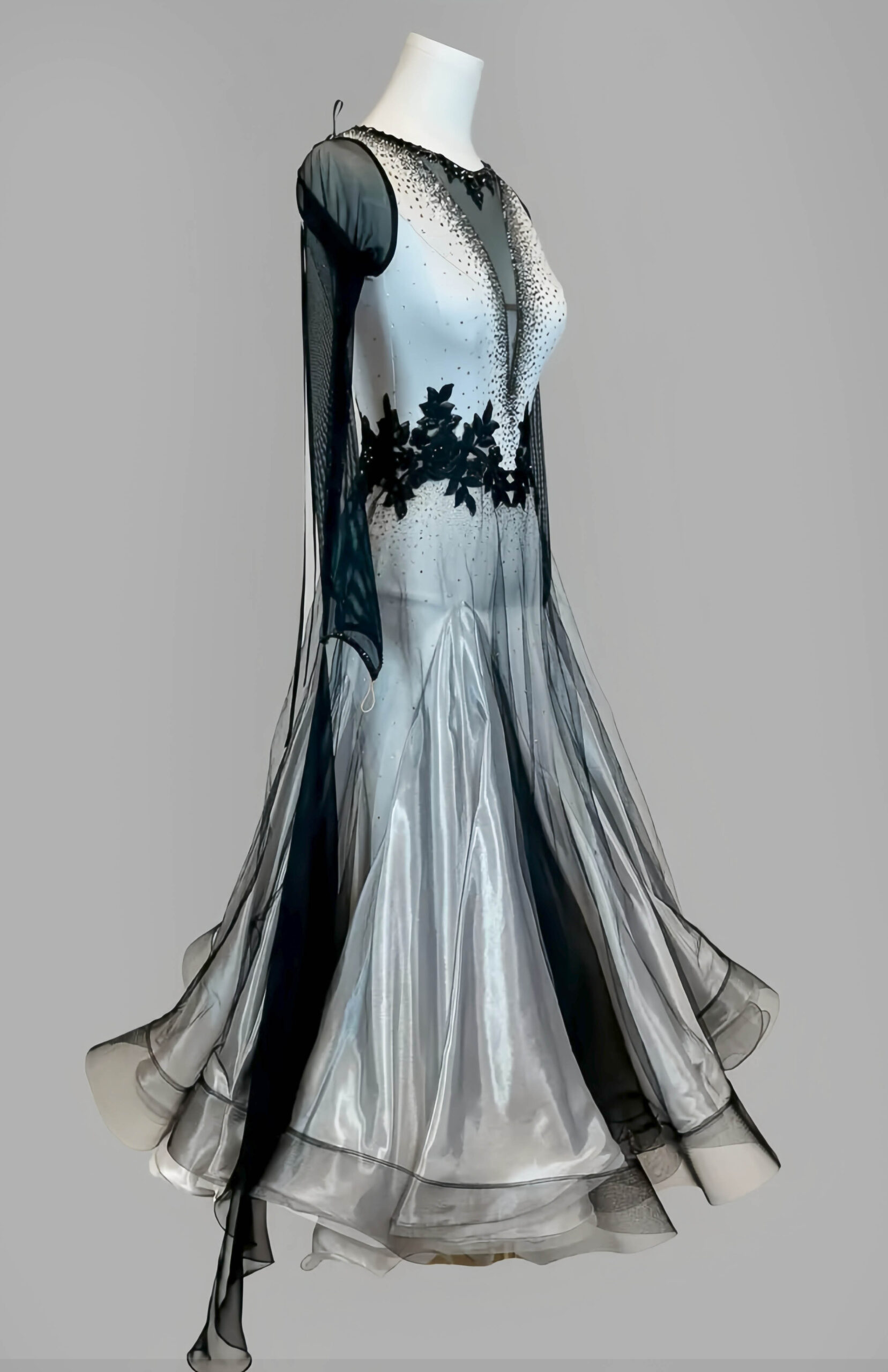 リトアニアのラグジュアリーダンスドレスブランドで、世界チャンピオンクラス、ファイナリストクラスの多くのトップ選手の絶大な支持を誇る「EMクチュール」制作のシルバー&黒の長袖のスタンダードドレスです。