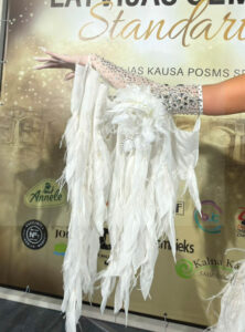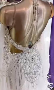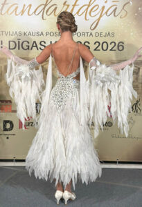 SK-DBF4 ロシア「アルテラ」がラトビアの世界選手権代表選手のために制作した、立体的なオーナメントと羽びっしりのスカートが超豪華で美しい白のスタンダードドレス(9号)