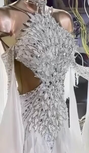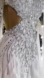 左右対称になったデザインで、ウェストラインが絞られてスタイルよく見えるようにベージュメッシュに切り替わっています。一見ウェストのサイド部分が開いているように見えますが、メッシュを使っているのでしっかりとサポートされて、体のラインをより細く、そしてスタイリッシュに見える視覚効果のあるデザインです。スカートにびっしりと装飾されたハンドメイドの白の花びらのようなオーナメント及びオーストリッチの羽の装飾が超豪華で美しく、袖の立体的なお花のオーナメント、美しいフロートのデザインも非常に特徴的で華やかです。