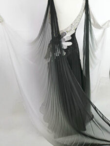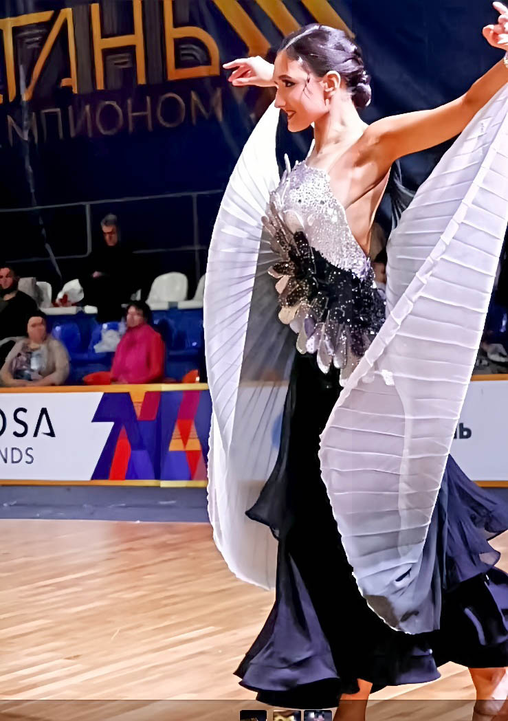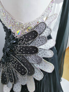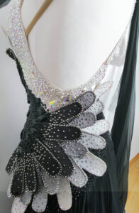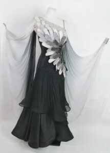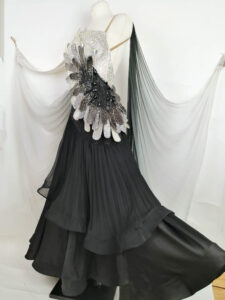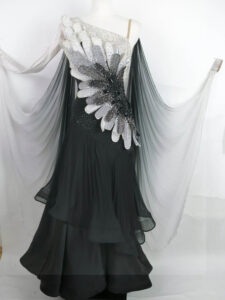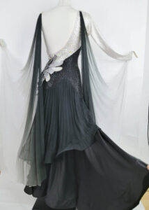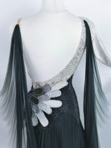 ロシア、サンクトペテルブルクのダンスドレスブランド、「ラヴレンティーナ&スカーレット」がロシアの選手のために制作した、黒~白のグラデーションが大変美しいワンショルダーのスタンダードドレスです。