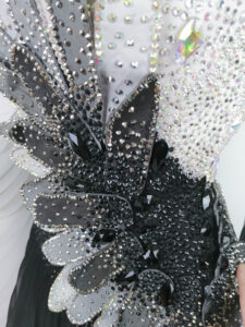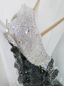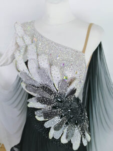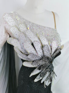 ワンショルダーで白のストレッチライクラ素材のボディ部分には大小のオーロラの石がびっしりと貼られています。斜めに切り替えて、まるで大きな花が広がるように黒、黒白グラデーション、ヘマタイト、白のオーナメントを装飾しており、ボディのデザインに大変なインパクトと豪華さがあり、絶対に目の離せない美しいデザインのドレスです。