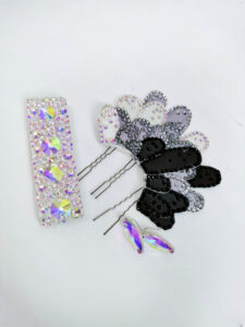 オーナメントの中央部分には黒の大きな石を集中的に装飾しており、オーナメントすべてにジェット、ブラックダイヤモンド、オーロラの石がぎっしりと貼られていて非常に存在感があります。