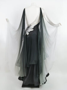 ワンショルダーで右側に袖があり、左側は袖がなく、両肩から白から黒のグラデーションがプリーツ加工された超インパクトたっぷりの大きなフロートがあります。フロートは左腕は石びっしりのバングルで手首で留める構造になっています。石びっしりのオーナメントが超印象的な髪飾りとピアス、バングルが付属しています。