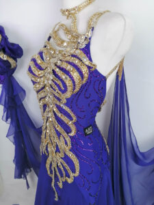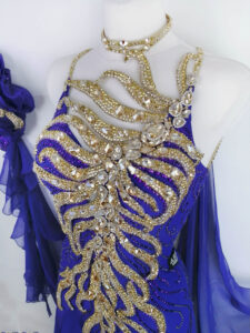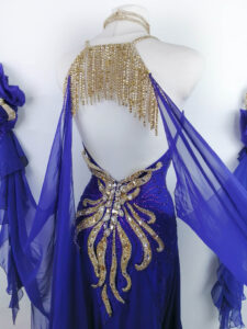 背中からヒップにかけてもゴールドのオーナメントが美しく装飾されていて、後ろ姿もインパクトたっぷりです。ボディ部分のサファイア色の布にはすべてコバルトの石が貼られています。大きな石を除き、使われている石はすべてプレチオサなので大変豪華に輝きます。ゴールド部分に使われている石はオーラム、クリスタルドラド、クリスタルゴールデンシャドー及びライトコロラドトパーズABです。