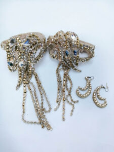 二の腕用に垂れ下がる石のチェーンが非常に美しいゴールドのバングルが2本付属しており、レースモチーフで制作されたゴールドのピアスも付属しています。