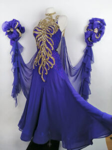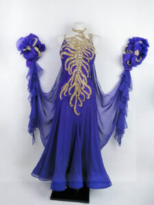 世界最高の超!ラグジュアリーダンスドレスブランド、ロシアの「ARTI」がイスラエルのチャンピオンで、世界選手権セミファイナリストのタイトルを持つ超素晴らしいスタンダードダンサー、エレオノーラ・メテリッツァ選手のために制作したサファイア色にゴールドのオーナメントを組み合わせた、石びっしりの最高に豪華なスタンダードドレスです。