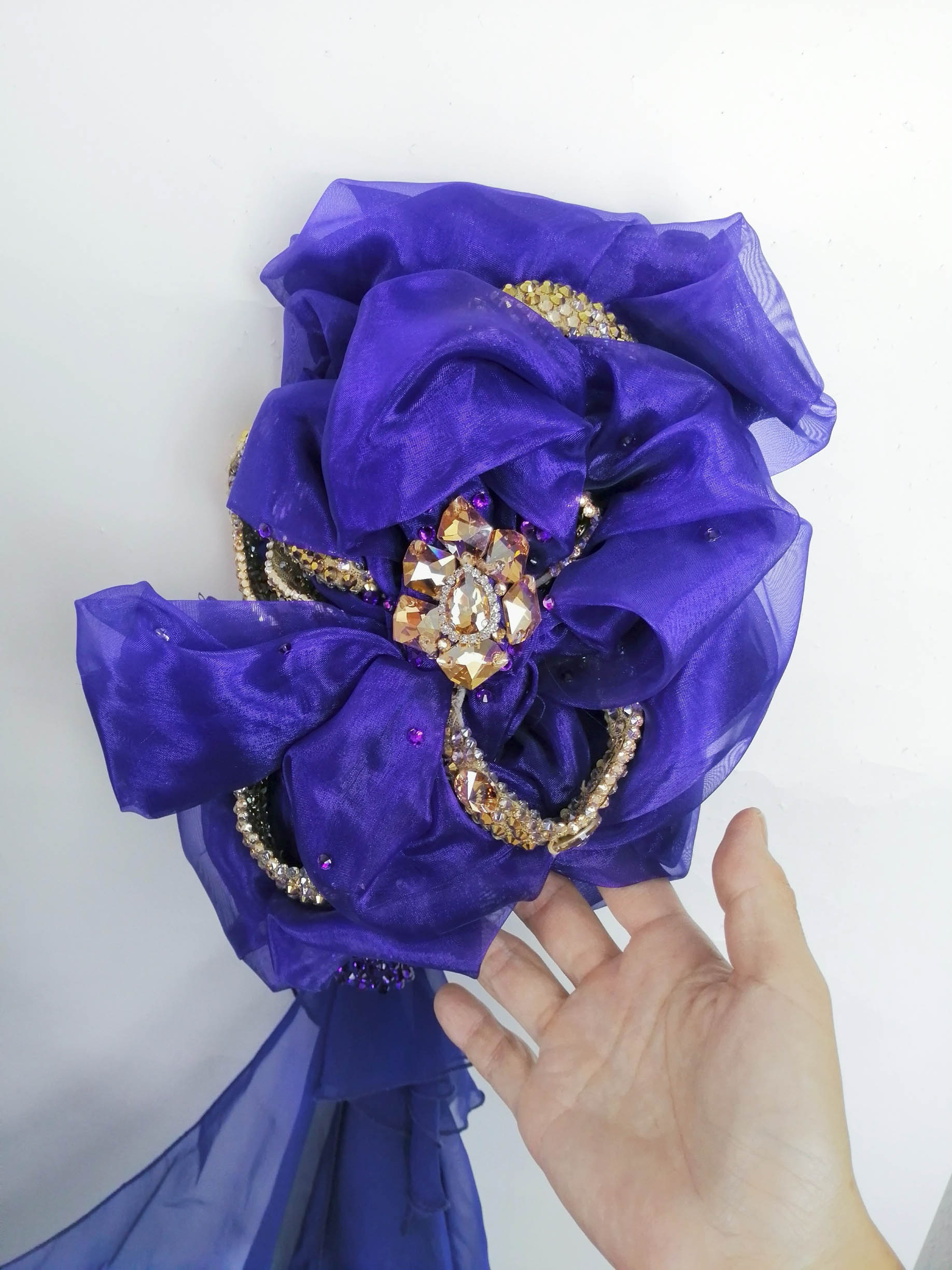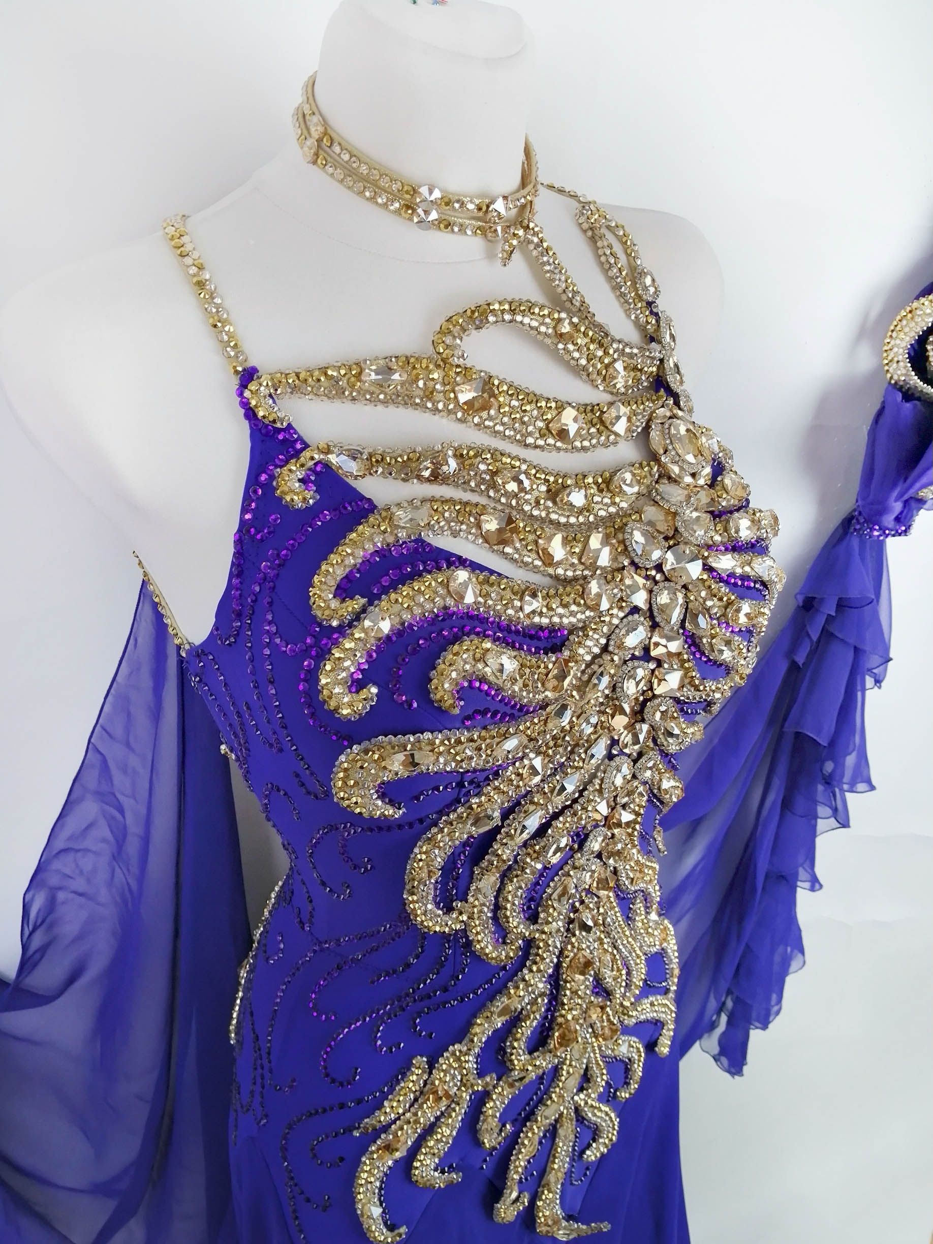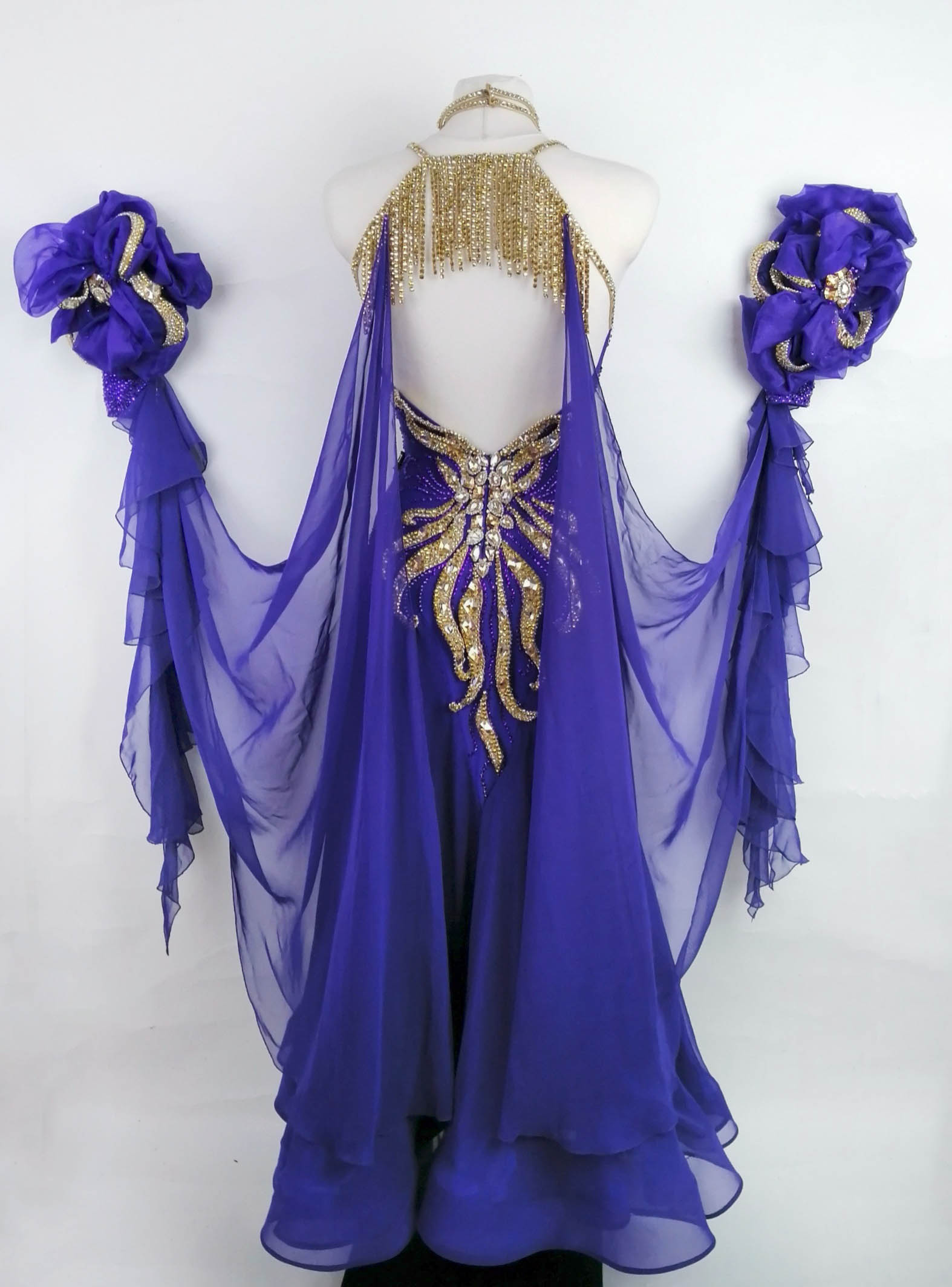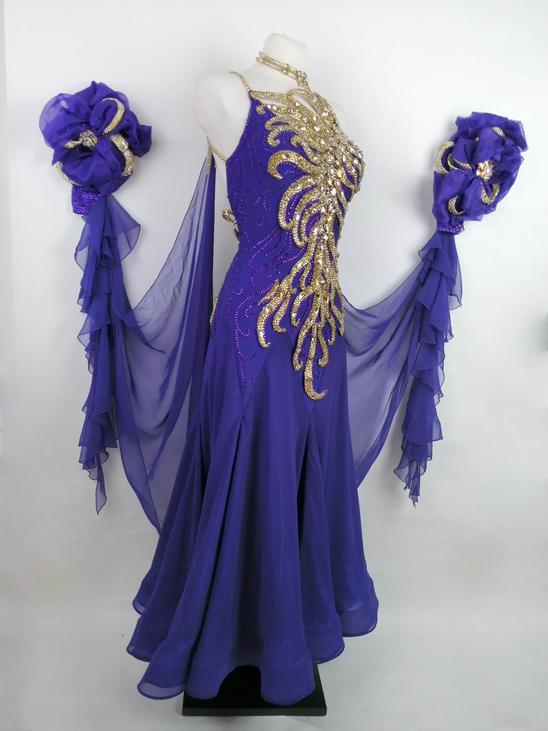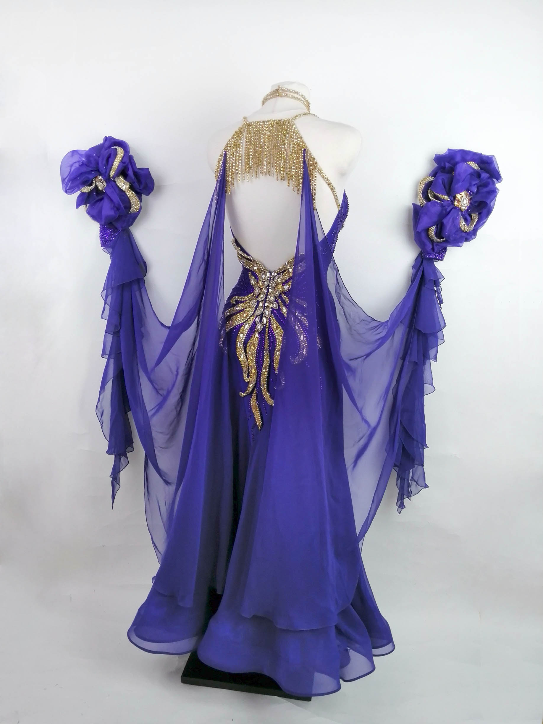石びっしりの短めのグローブには 立体的な豪華で美しい花がつけられており、ゴールドのオーナメントの装飾が非常に豪華で華やかです。フリルの小さいフロートが垂れ下がっており、さらにドレスからグローブにつながる大きなフロートも大変よく踊ります。大きなフロートはホックで取り外しが可能です。