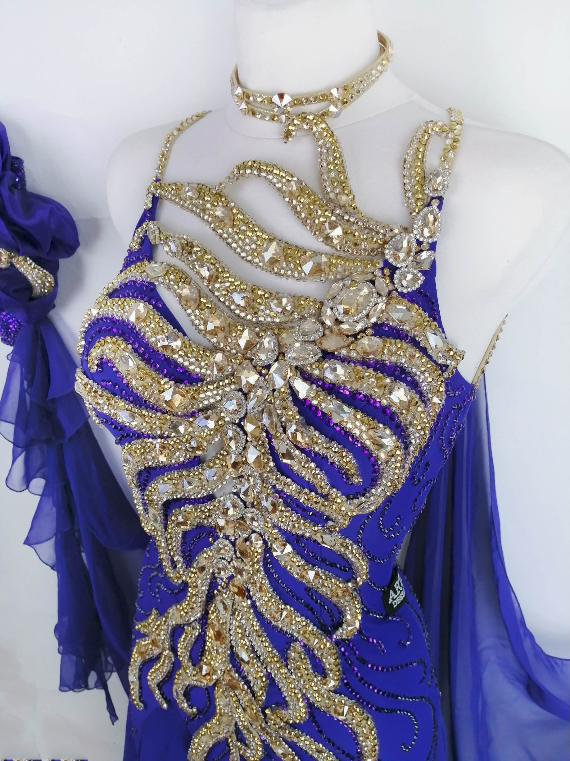 世界最高の超!ラグジュアリーダンスドレスブランド、ロシアの「ARTI」がイスラエルのチャンピオンで、世界選手権セミファイナリストのタイトルを持つ超素晴らしいスタンダードダンサー、エレオノーラ・メテリッツァ選手のために制作したサファイア色にゴールドのオーナメントを組み合わせた、石びっしりの最高に豪華なスタンダードドレスです。