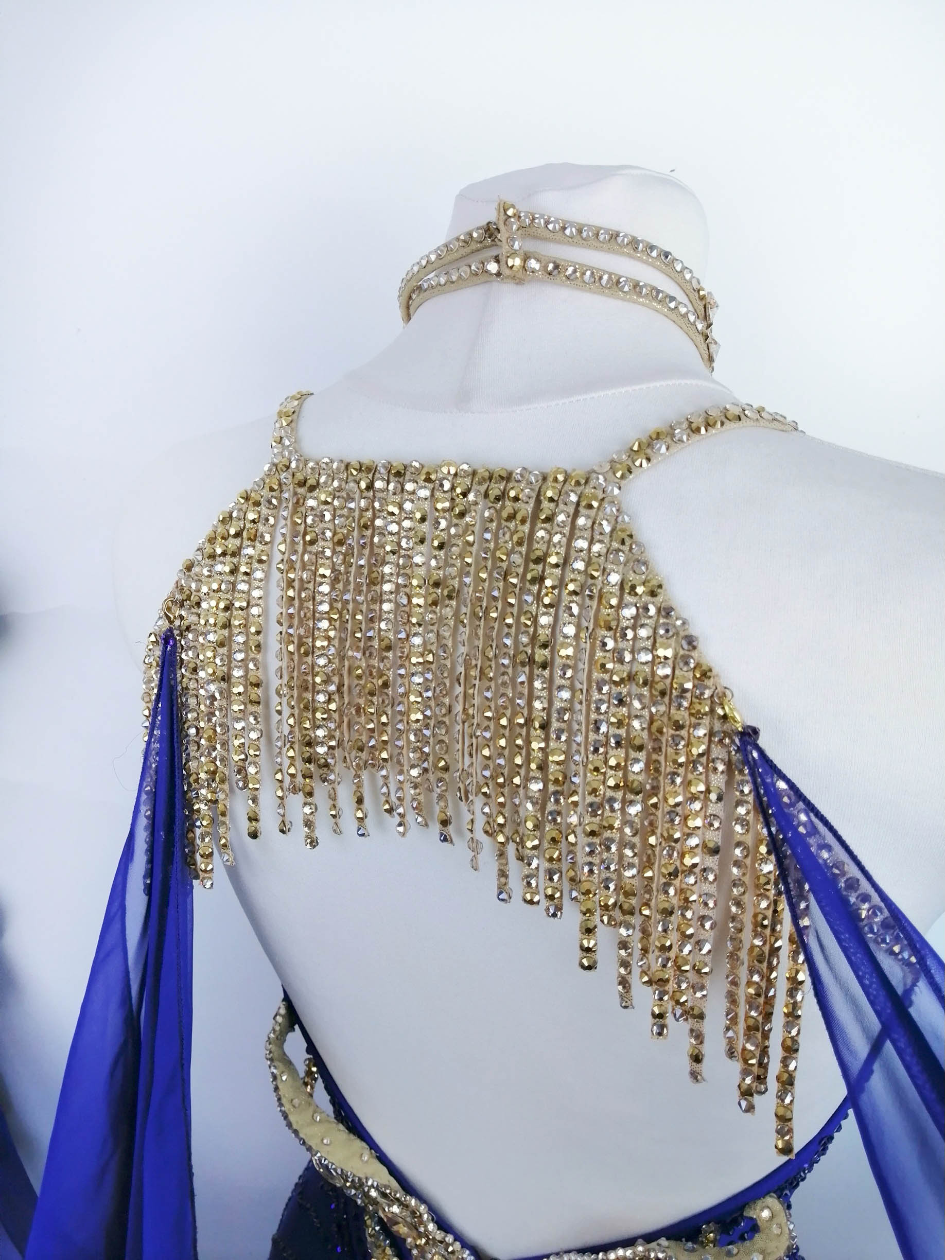 背中からヒップにかけてもゴールドのオーナメントが美しく装飾されていて、後ろ姿もインパクトたっぷりです。ボディ部分のサファイア色の布にはすべてコバルトの石が貼られています。大きな石を除き、使われている石はすべてプレチオサなので大変豪華に輝きます。ゴールド部分に使われている石はオーラム、クリスタルドラド、クリスタルゴールデンシャドー及びライトコロラドトパーズABです。