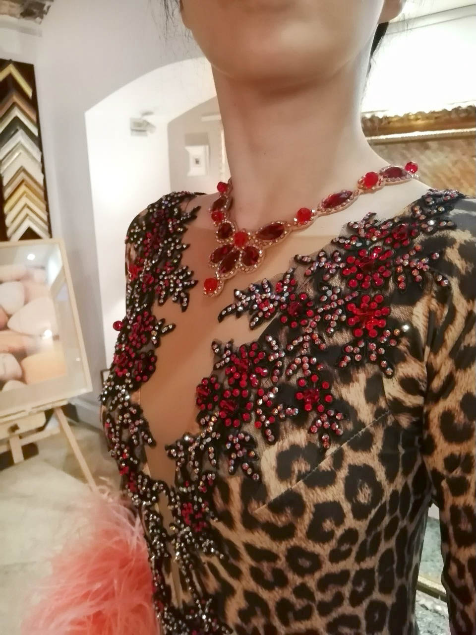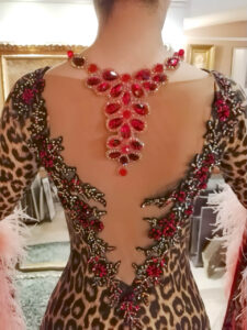 赤の大きな石を使った美しいチョーカーはドレスと一体型になっています。