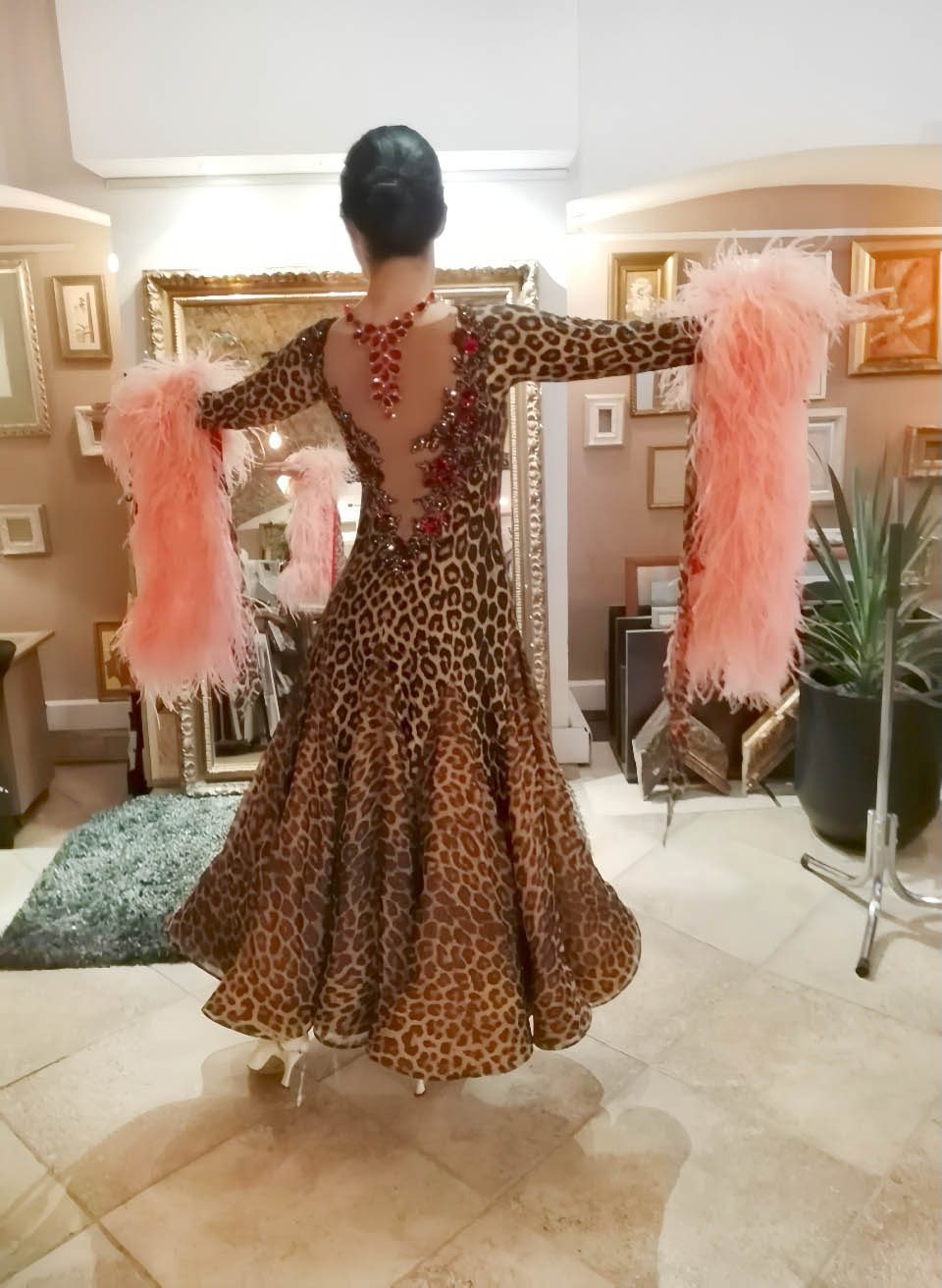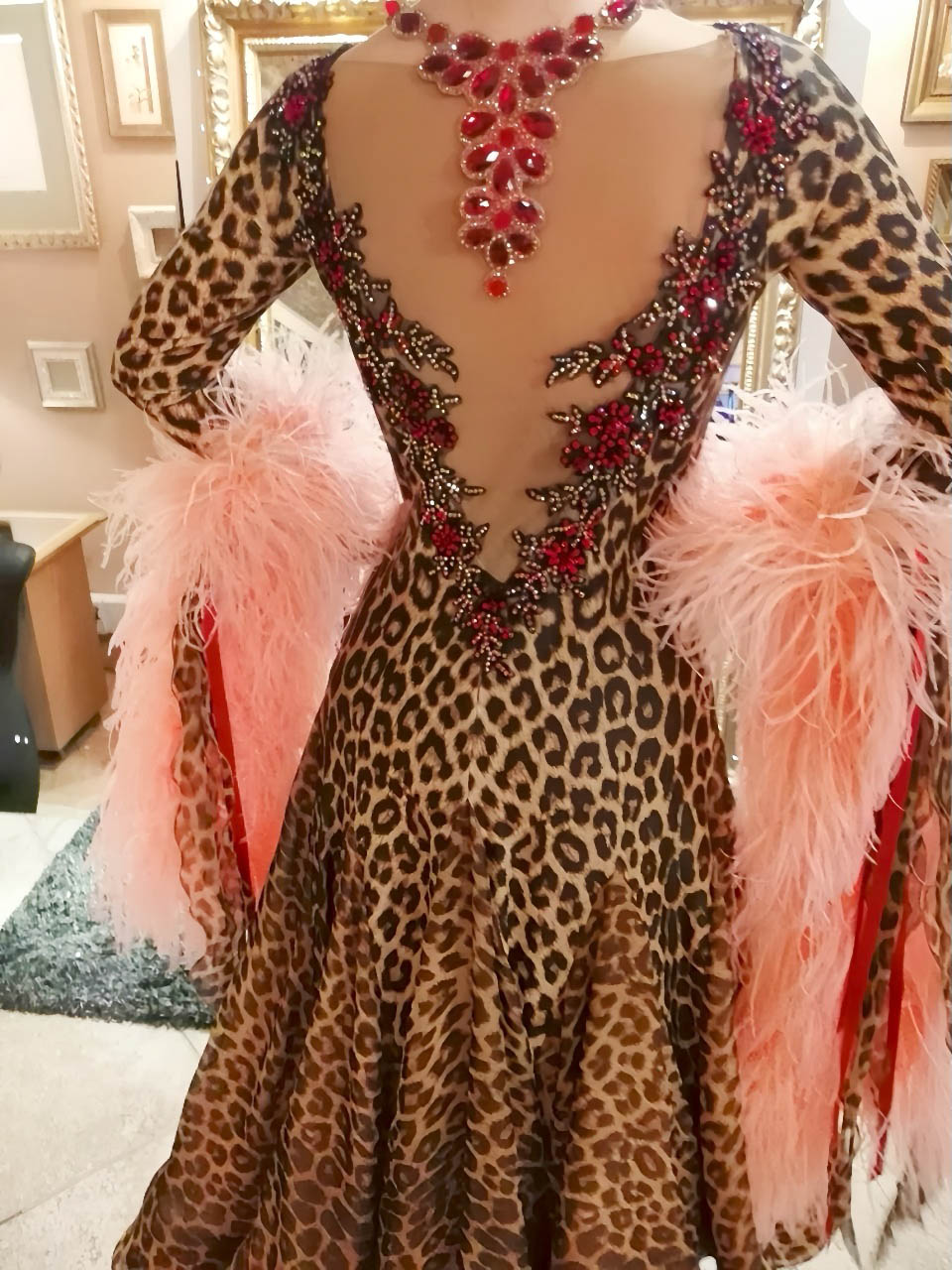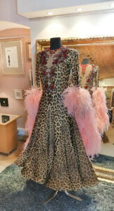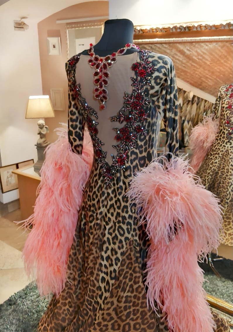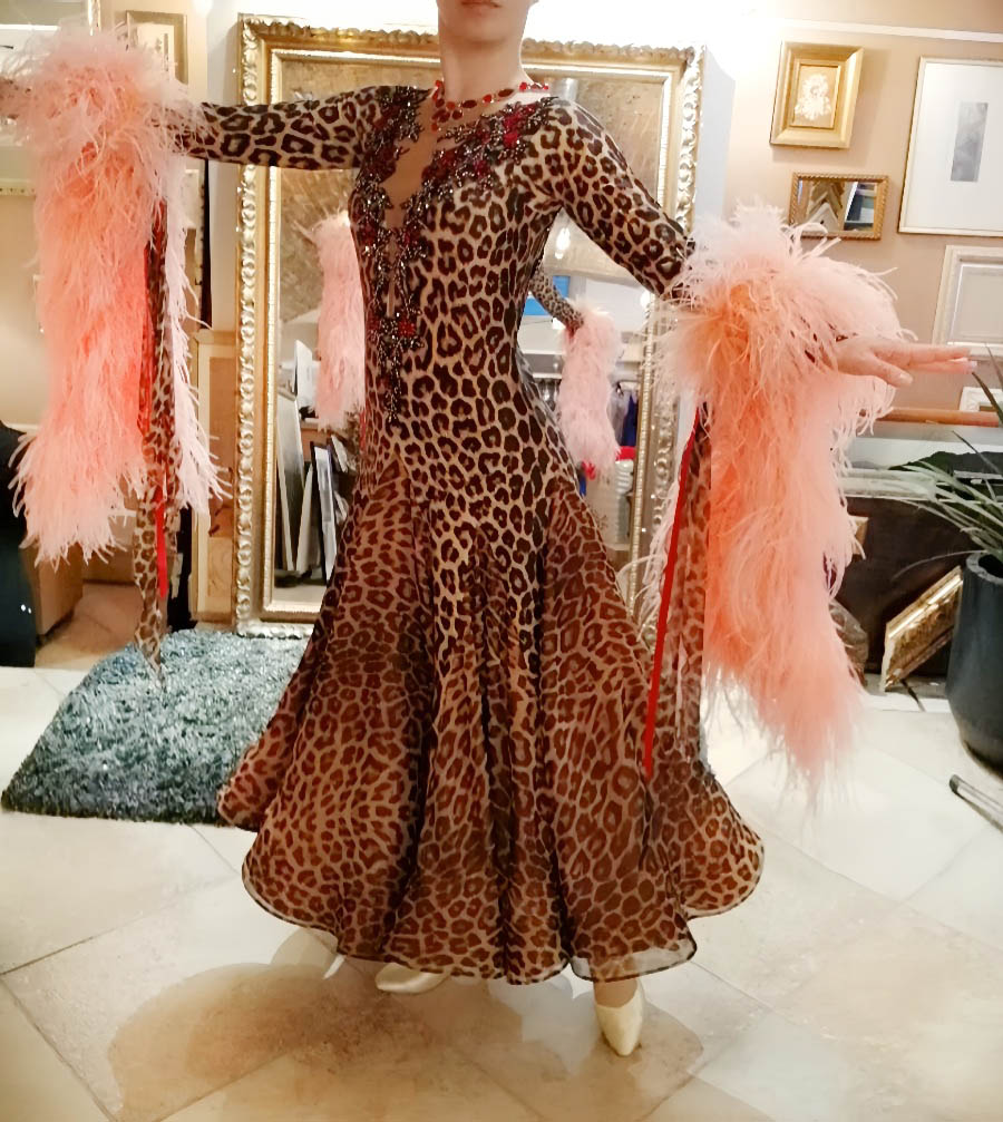 SK-KBE4 リトアニアで制作された、リトアニアのシニア選手のために制作されたピンクのオーストリッチの羽がゴージャスな超スタイルよく見えるヒョウ柄の長袖のスタンダードドレス(11号ー小さ目13号)