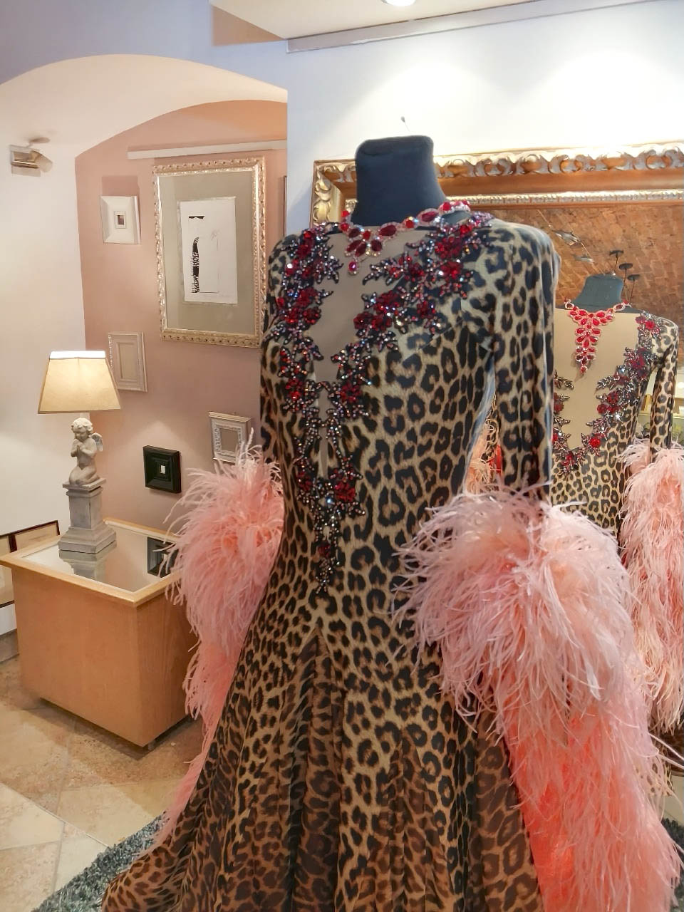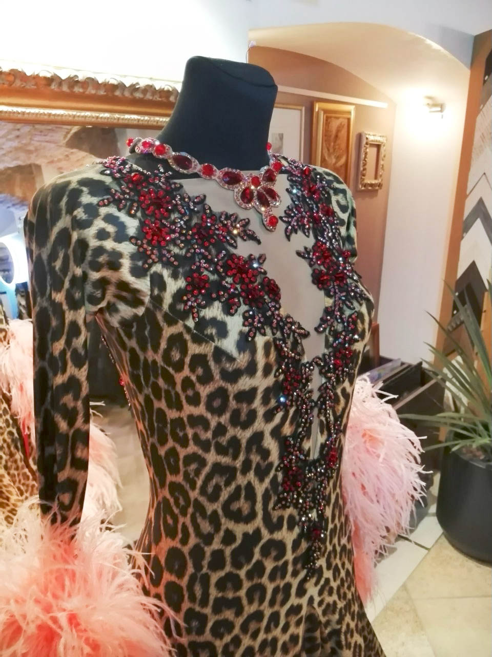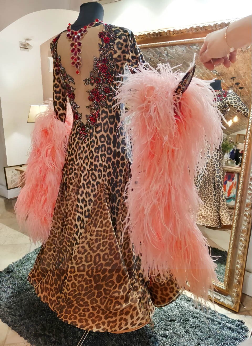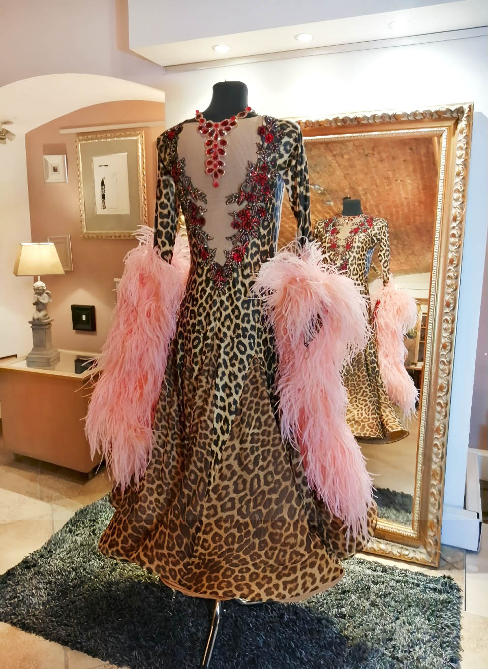 SK-KBE4 リトアニアで制作された、リトアニアのシニア選手のために制作されたピンクのオーストリッチの羽がゴージャスな超スタイルよく見えるヒョウ柄の長袖のスタンダードドレス(11号ー小さ目13号)
