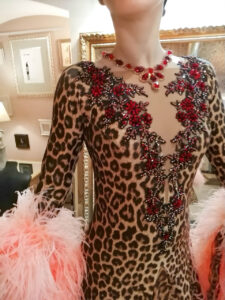 リトアニアのシニア選手のためにリトアニアで制作された、大変スタイルよくほっそりと見える長袖の全身ヒョウ柄にピンクのオーストリッチの羽を組み合わせたスタンダードドレスです。