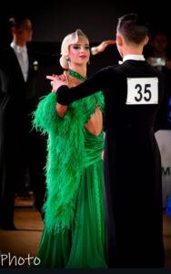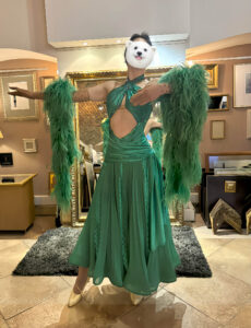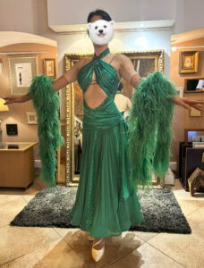 ラトビアのラグジュアリーブランドで、2025年のユース世界チャンピオンや世界の多くのトップクラスの選手のドレスを制作しており、最近大変注目されている「アローナ・ミャリック」がラトビアの選手のために制作した、スタイリッシュで超かっこよく、大変スタイルよく見える絶対に目が離せないエメラルドグリーンのスタンダードドレスです。