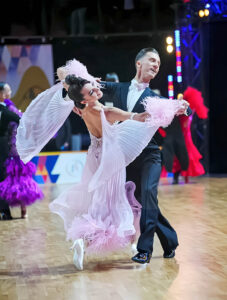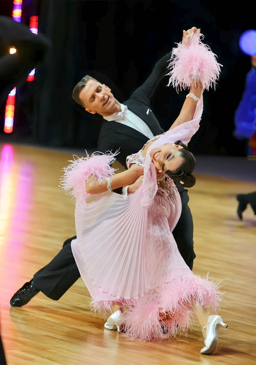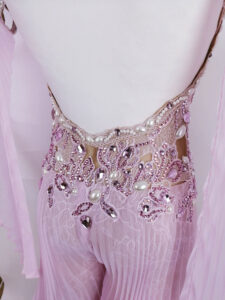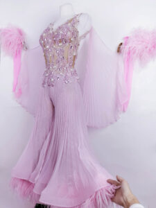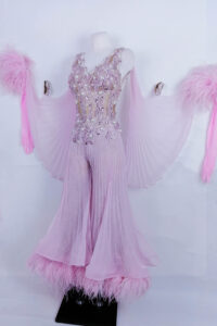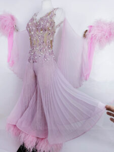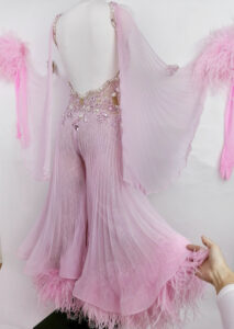 プロフェッショナル欧州選手権ブロンズメダリスト、ジャーマンオープンファイナリストなどのタイトルを持つ超素晴らしいロシアのスタンダードダンサー、エリーナ・ココトワ選手のためにロシアのフィネリ・クチュールが制作した、プリーツ、レース、オーストリッチの羽を組み合わせたスタイリッシュなパンツスタイルが大変ユニークで絶対に目が離せない超美しいピンクのスタンダードドレスです。