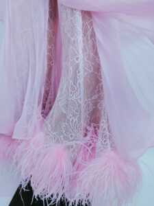 ベージュメッシュの裾が広がったキュロットの上に美しいイギリス製のストレッチレースを重ね(裾にホースヘアあり。レースのパンツにオーストリッチの羽を縁取り)、そして一番上にプリーツ加工されたジョーゼットのスカートを重ねています。パンツスタイルになっているのはベージュメッシュのアンダーキュロットとレースのキュロットのみで、一番外側のプリーツのスカートは内側の縫い目を閉じていません。