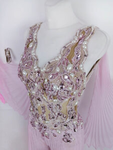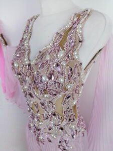 ノースリーブで背中は開いたデザインで、ボディ部分はベージュメッシュの上に縦のラインを出すように美しくレースモチーフの装飾があり、円形や楕円形などの立体的なパール、ピンク系の大小のスワロフスキの石などを使って豪華に美しく装飾されています。